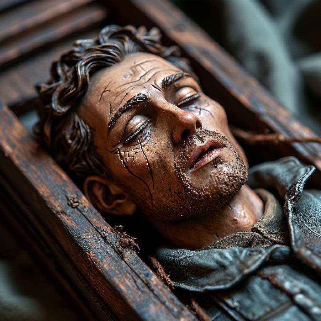 Убедившись, что охранные чары рассеялись, Анна осторожно шагнула вперёд. Её пальцы впились в край грубо сколоченного стола, когда она наклонилась над маленьким гробом. То, что она увидела, одновременно обожгло её облегчением и ледяным ужасом — перед ней лежал восковой вольт, до жутких подробностей повторяющий внешность её мужа.