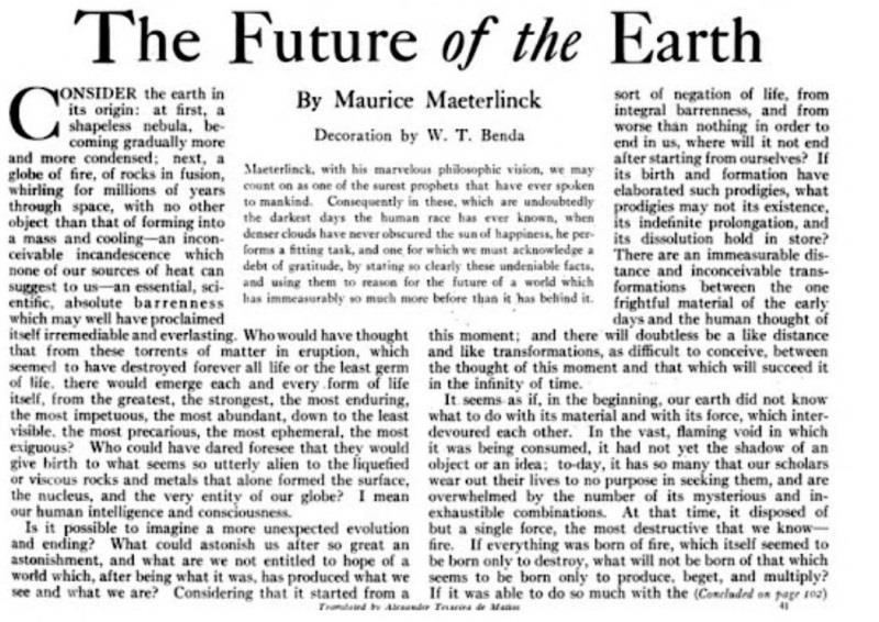 Кажется, эссе Метерлинка "Будущее Земли" на русский еще не переводилось - может быть, потому, что было опубликовано на английском (в переводе с французского), и этот источник ускользнул от внимания литературоведов. Впрочем, не берусь судить категорично, возможно, они о нем знают, просто не включали в свои публикации.