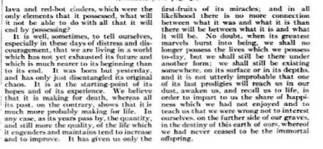 Хорошо иной раз говорить самим себе, особенно в эти дни тяжелых переживаний и разочарований, что мы живем в мире, который еще не исчерпал свое будущее и находится гораздо ближе к началу времен, чем к их концу. Он был рожден лишь вчера, и едва сумел преодолеть свой первозданный хаос. Он находится в первоначальной стадии своих надежд и испытаний. Мы убеждены, что он движется в сторону смерти, хотя все его прошлое, наоборот, показывает нам, что, вероятнее всего, он устремлен к жизни. В любом случае, по мере того, как проходят его годы, количество, и, что еще важнее, качество той жизни, которую он порождает и поддерживает, постоянно возрастает и совершенствуется. Он дал нам только первые плоды своих чудес, и, по всей вероятности, то, чем он когда-то был и тем, чем он стал, гораздо менее похоже на то, чем он является ныне и чем он станет в будущем. Несомненно, когда его величайшие чудеса прорвутся в реальность, мы больше не будем обладать нашими нынешними жизнями, но перейдем в другую форму. Мы все-таки продолжим существовать где бы то ни было, на поверхности планеты или в ее недрах, и вовсе не кажется невероятным, что одно из последних чудес застигнет нас в виде праха, пробудит нас и призовет к жизни, дабы разделить с нами счастье, которого мы доселе не испытали, и дать нам понять, что мы ошибались, не интересуясь, находясь по другую сторону могилы, судьбой нашей Земли, хотя никогда не переставали быть ее бессмертными отпрысками.