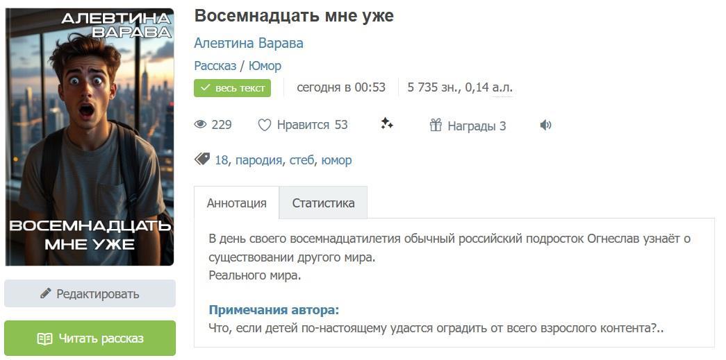 На сайте, где притаились рассказы про изнасилования с плашкой «18+» он, вообще-то, бывал. Читывал там о бравых защитниках от хулиганов, помощниках и даже спасителях мира от каких-то карикатурных злодеев. Вообще, Огнеслав считал современную литературу отстойной. У него складывалось впечатление, что после 1990 года ничего нормального вообще не писали. Но вот сейчас вдруг оказалось, что писали, просто всё – с плашкой «18+», досель непреодолимой.