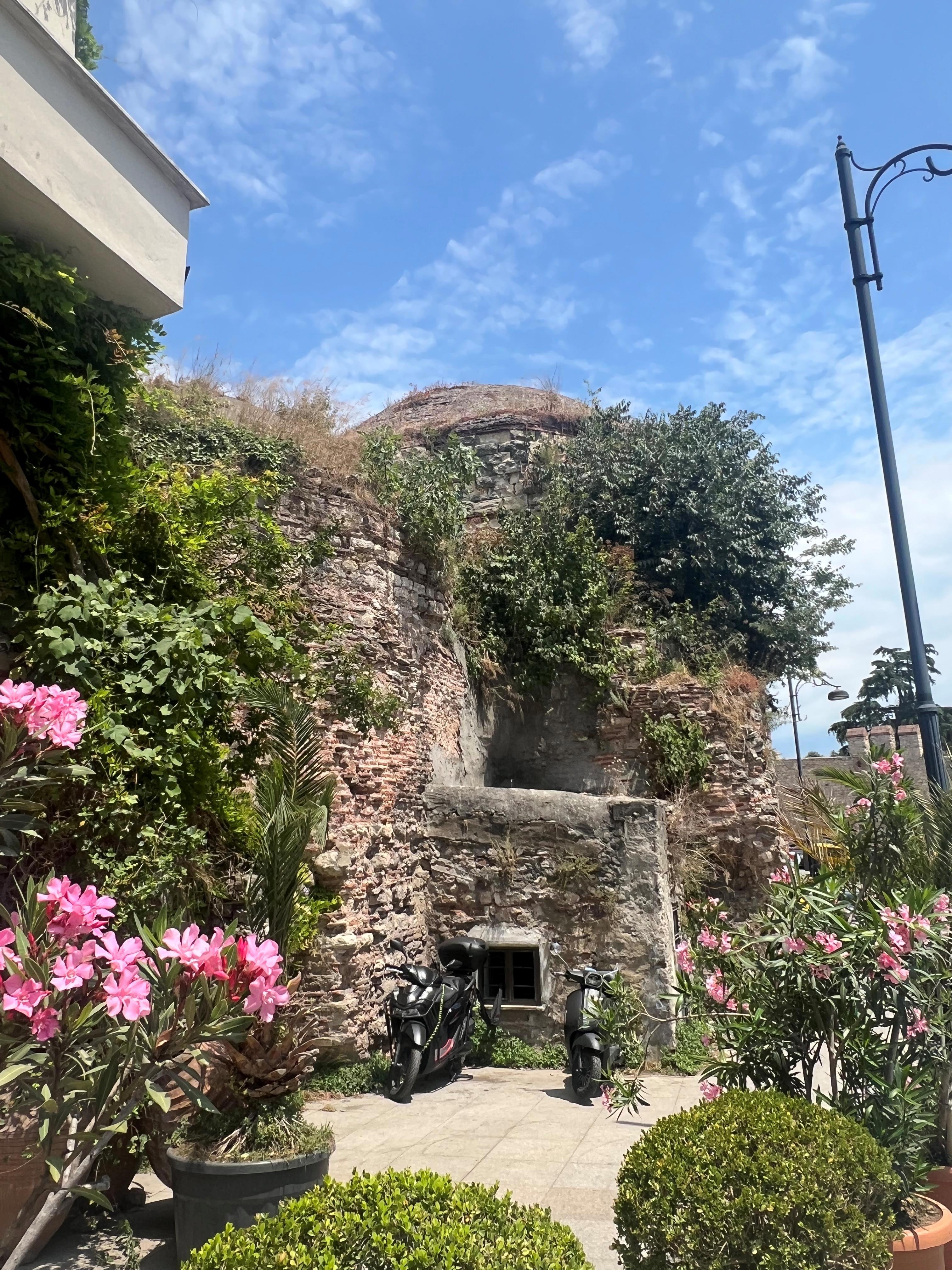 Кусок так называемых Феодосиевых стен. Построенные в 5 в. стены сделали Константинополь неприступным с моря. Таковым он оставался тысячу лет. Толщина основной фортификационной линии составляла 5 м, высота - 18-20 м. Лишь в 15в. османский султан Мехмед II с помощью огромной бомбарды - супероружия своего времени - сумел радикально разрушить стены в трёх местах. Через эти бреши его войско проникло в город после долгой осады, и Константинополь пал... Завершилась его византийская история и началась османская.