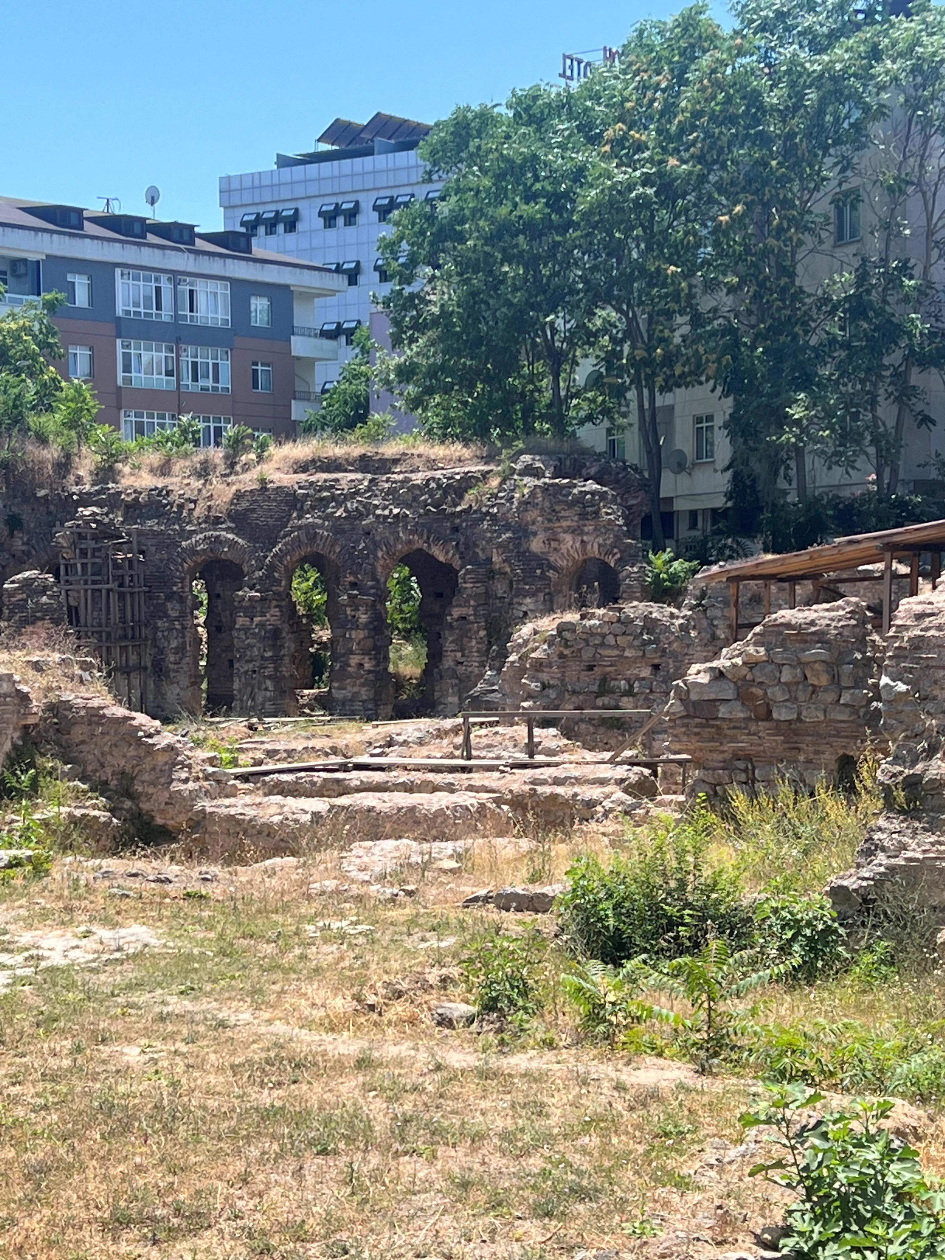 Не в лучшем виде развалины дворца Даматрис на азиатском берегу Стамбула. Его в 6в. построил император Маврикий, написавший грандиозный военный труд "Стратегикон". В моей книге - в нём разместилось русское войско, охранявшее ладьи, поднявшиеся по реке Рива и её притоку. Развалины обнесены забором, висят таблички, сообщающие о реконструкции. Кое-где постройки окружены лесами. Но деятельности никакой не заметно, леса потрёпанные. Одна видимость, короче.