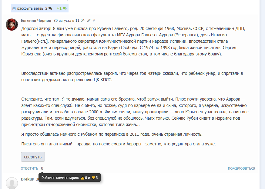 Ничего плохого о Гальего, как о писателе, я не говорила и не говорю. Он лучше всех ДЦП-ШНЫХ и многих антисоветских писателей по мастерству, потому и я просила любимого автора альтернативщика обратить внимание на эту судьбу.