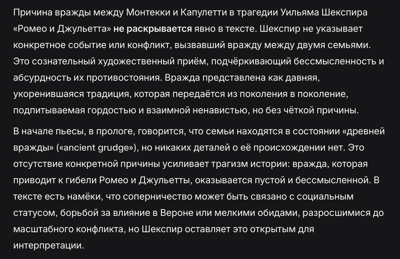 Монтекки и Капулетти древние роды кого? Торгашей? Лавочников? Пустота причин — усиливает трагизм? Как вообще можно сравнить племенную вражду степных народов, с блевотными стычками веронских горшечников?! Где тут величие и трагедия?