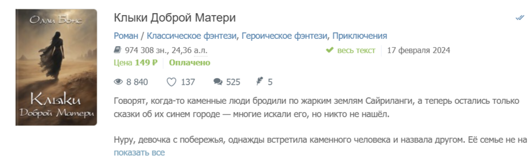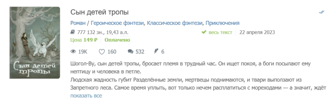 "Сына" и следующую книгу цикла "Клыки доброй матери" я определила бы как этнофэнтези. Олли изучила культуру, язык и обычаи и переплавила свои знания в виде увлекательной дорожной истории, в которой представители трех разных народов, которые вдобавок еще и враждуют, учатся находить общий язык, называть друг друга по имени, и в итоге спасают мир от рассерженных распрями богов, ни много ни мало. Это именно такая книга, которая нужна людям сейчас больше всего. Ну, это мое мнение.