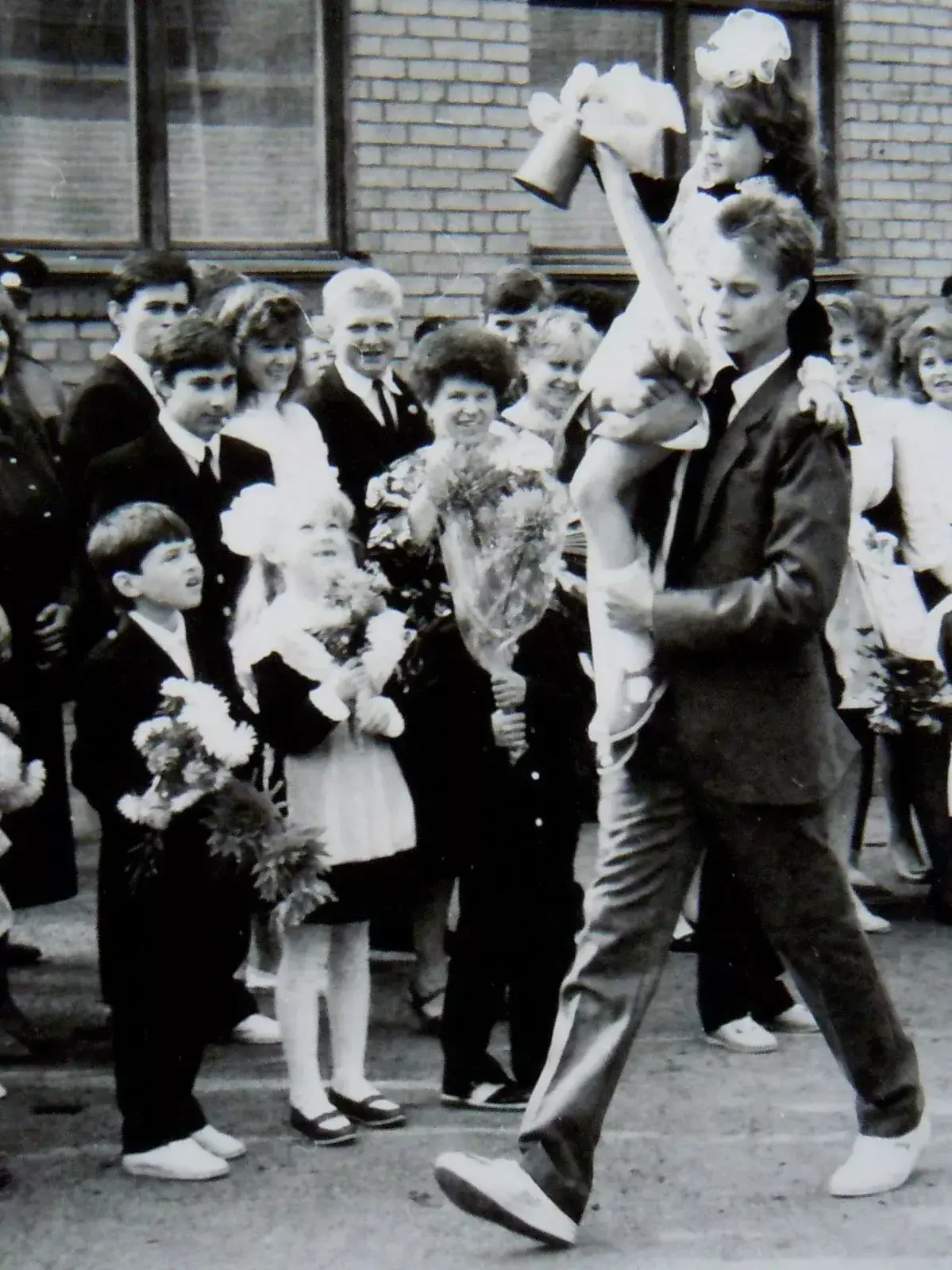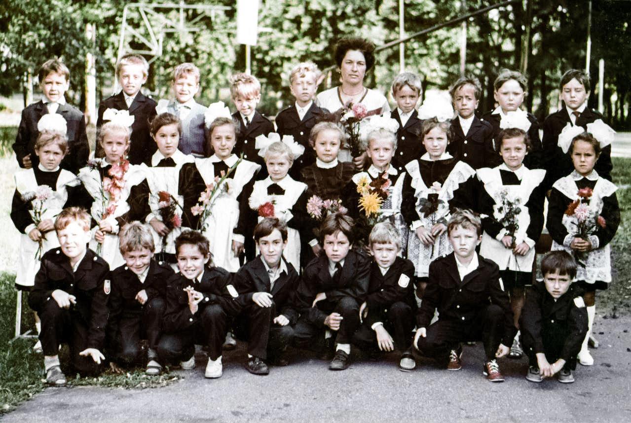 Замок щёлкнул и за нами захлопнулась дверь.По улице шли банты с ранцами, белые фартуки и синие курточки с красными звёздочками на груди. Маленькие детские руки несли разноцветные букеты. Астры, георгины, хризантемы — разноцветный парад, подхваченный суетой и волнением, маршировал к воротам школы.