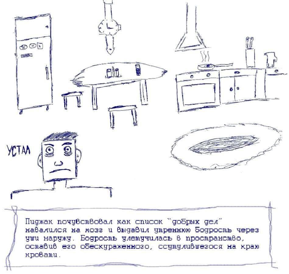 Далее мы встречаем-таки главного героя. Зваться он будет Пиджак, и он мелкий организм в мутной водице офисного планктона. Но неужели ж боле ничего меня за душой нету, спрашивает Пиджак. Он мастер задавать вопросы.