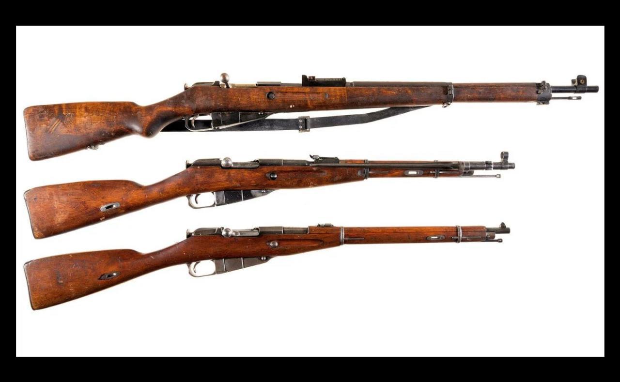 Если кто не в курсе - карабин - это укороченная и максимально облегченная винтовка. На фото - сверху финская мосинка, внизу два карабина. Патрон один и тот же и по законам физики отдача у легкого карабина сильнее выходит.
