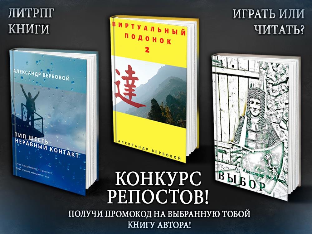 Автор: Александр ВербовойМногие мои читатели наверняка уже заметили, что я завершил Виртуальный Подонок 2. Сейчас работаю над своим пятым романом Выбор. В связи с этим завтра в группе ВК ЛитРпг книги - играть или читать? намечается розыгрыш пяти промокодов. Каждый из победителей сможет выбрать промокод для любой из моих книг. Следите за публикациями в группе.