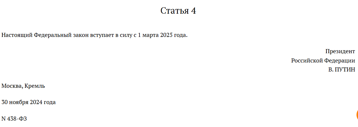 Ну да ладно. А теперь обратите внимание на ряд цифр под названием документа. Это ВСЕ изменения, внесенные в интересующий нас закон на данный момент. Больше изменений нет. Последние цифры 30.11.2024 №438-ФЗ. Нам просто необходимо его открыть. Нам нужна статья 4.