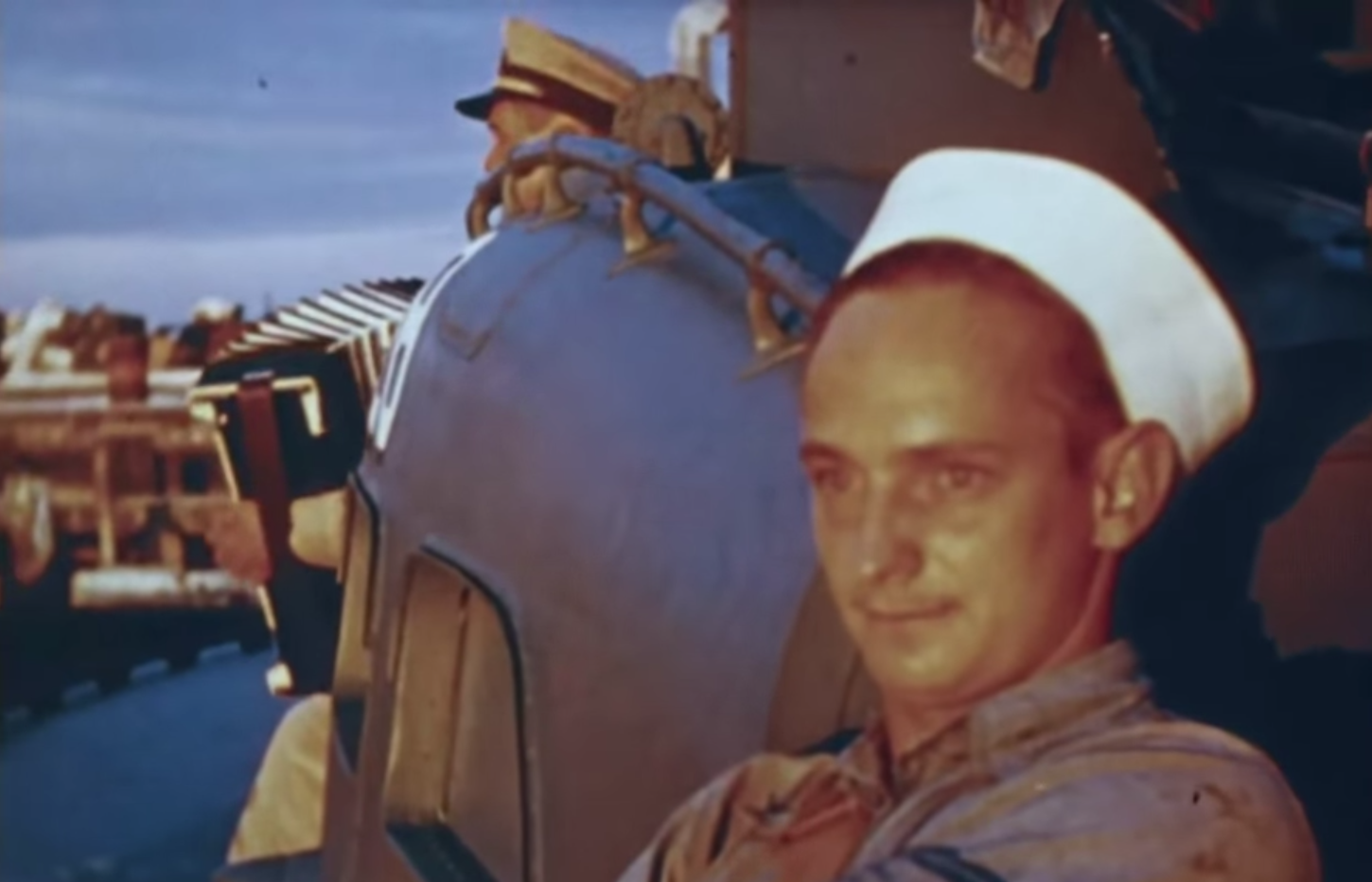 это кадр из документального фильма Джона Форда "Битва за Мидуэй". Если кто не в теме, но хотя бы смотрел недавнее поделие Эмериха - там по острову бегает смешной типчик с кинокамерой, а за ним оператор с камерой побольше. Это уже легендарный к тому моменту режиссер Джон Форд и оператор Джозеф Огаст