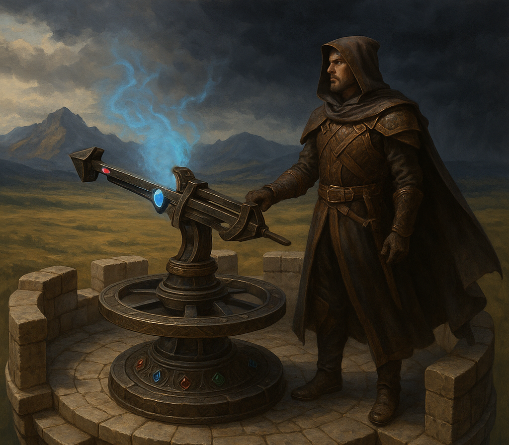 Второе устройство - это Охладитель. Это также "записанные" на камень сильные чары, запускаемые вручную, которые охлаждают воздух на большом расстоянии, заставляя тучу пролиться дождём. Чтобы нацелить магию на тучу, используется вращающаяся платформа, которой можно прицеливаться как из баллисты.
