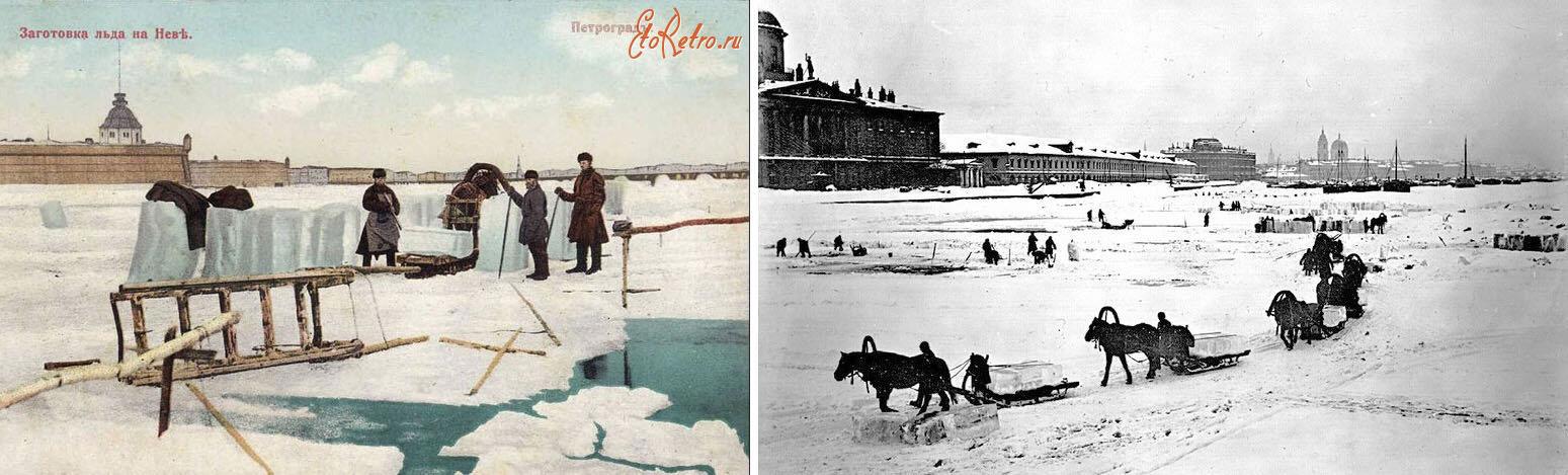 В Петербурге лед добывали в конце зимы на Неве. Коммерсанты арендовали для этого участки на реке. Лед нарезали с помощью специальных приспособлений на большие параллелепипеды – "кабаны". Затем погружали их на телеги и развозили по хранилищам.