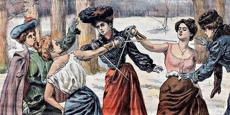 Неожиданно, правда?)) В 1552 году две молодые особы, Изабелла де Карацци и Диамбра де Петтинелла, вышли на поединок за любовь мужчины по имени Фабио Дзересола. Как точно прошла дуэль – остаётся загадкой. Известно, что ни одна из девушек серьёзно не пострадала. А в самом Неаполе потом ещё долго вспоминали тот странный поединок, ну а мужчина, если верить источникам, в итоге не выбрал ни одну из дуэлянток и ушел в розовый закат с третьей красоткой (впрочем, я его понимаю))) И примерно с того прецедента и начинается история женских поединков. В отличии от мужчин, женщина имела полное право не принимать вызов, при этом не потеряв лицо. Так что все поединки проходили исключительно по обоюдному согласию. Зачастую дамские дуэли проходили "топлес". Есть версия, будто это было связано с опасением получить заражение из-за одежды в случае раны, но мне она кажется несостоятельной хотя бы потому, что тогда и мужчины бы, наверное, сражались голышом.