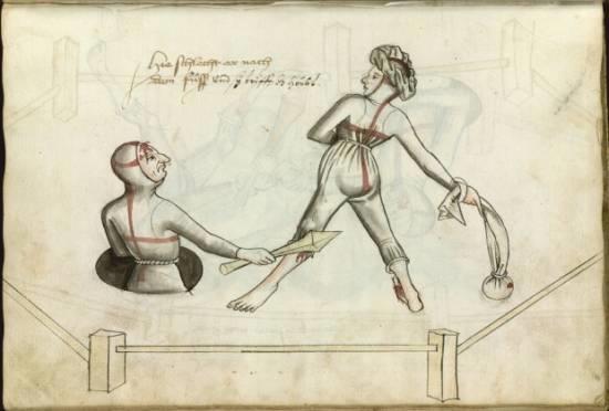 Относительно дуэлей смешанных, где женщина бросает вызов мужчине или наоборот, информации гораздо меньше (или просто я до нее еще не добралась). Однако в качестве "судебного поединка" такие варианты случались. Считалось, что бог обязательно должен быть на стороне того, кто прав. Для того, чтобы сравнять шансы женщины и мужчины, последнего помещали по пояс в яму.Выглядело это как-то так: