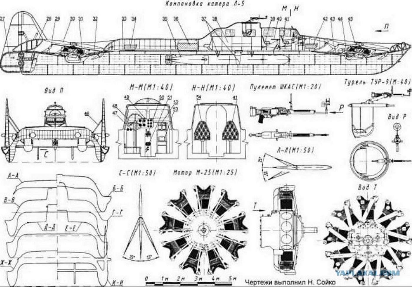 Первые в мире катера такого типа были созданы в СССР в 1939 году группой конструкторов под руководством профессора Левкова В.И. Вот схема опытного катера Л-5: