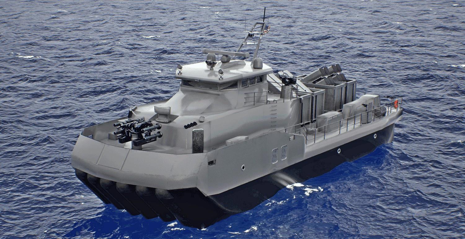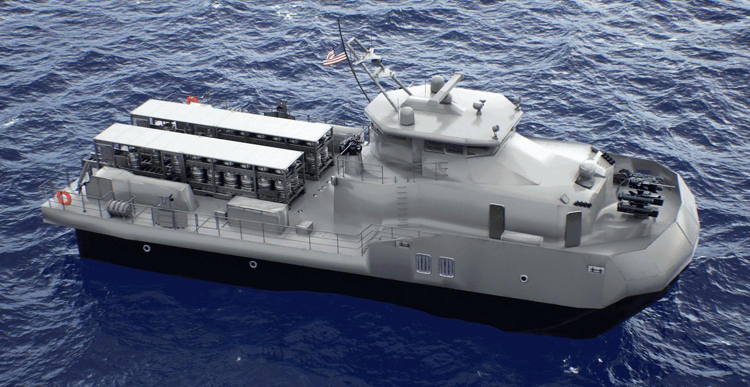 То есть в целом катерок вполне помещался в размер «Medium». Пассажирский салон убирается, а на его месте появляется грузовая платформа. На ней можно разместить два стандартных контейнера с вооружением длиной 12 метров каждый. Если всё пойдёт хорошо, то компания обещает построить ещё и катерок поменьше с возможностью размещения одного стандартного контейнера длиной 6 метров. Но это «потом», а пока предлагается в картинках, например вот такой катер для постановки мин: