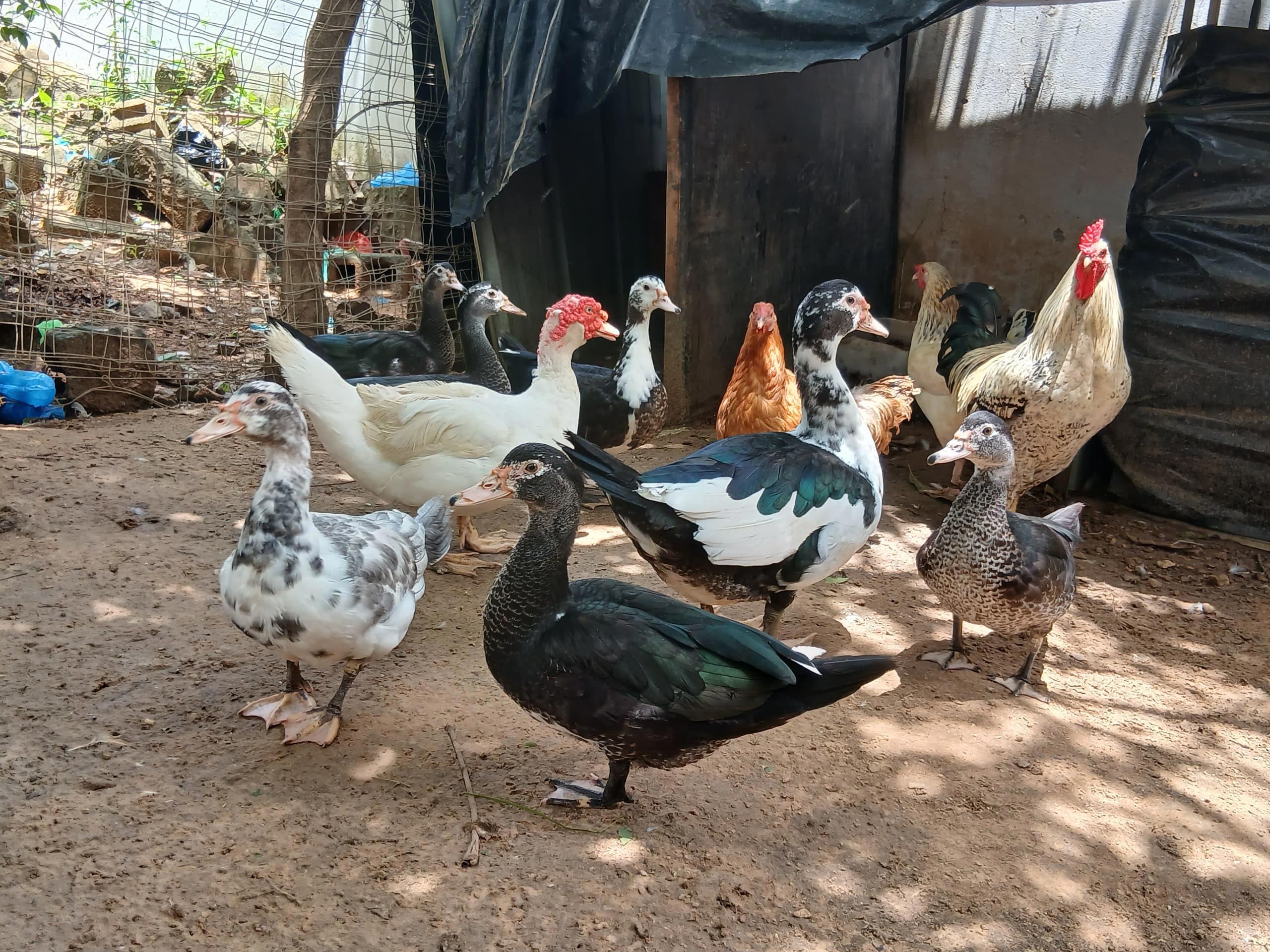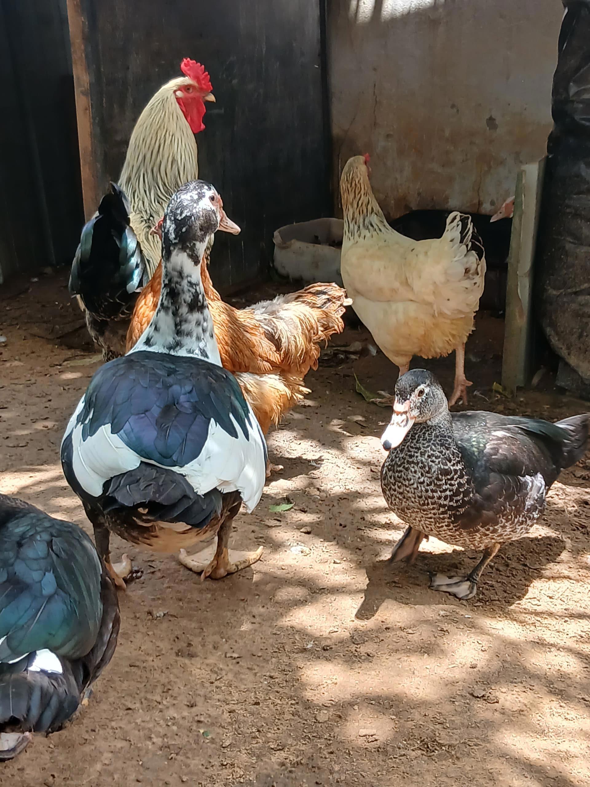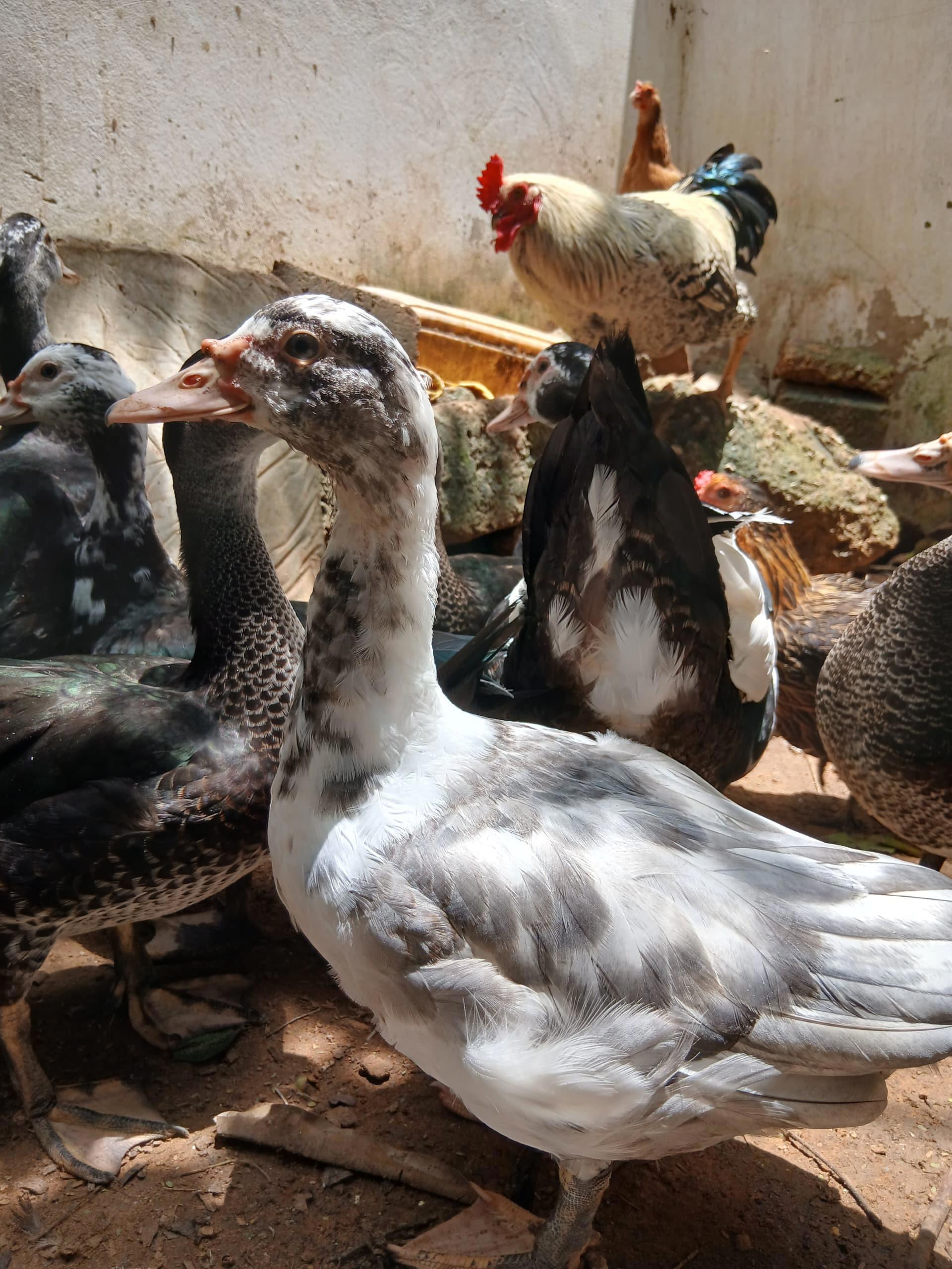 Звать этого хулигана всея Сенегала - Снежок! Правда, мыться Снежок не любит, поэтому чаще напоминает мне питерский весенний снежок. А рядом с ним - его дочка. (Кажется, это всё же уточка). Это был мой первый утёнок, я сама помогала ей вылезти из яйца и обсушивала дома в детской шапочке. И вот.
