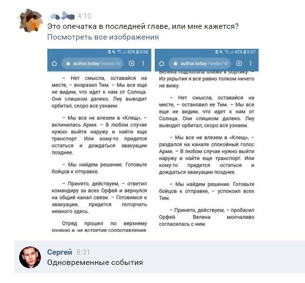 Автор: Серж ТомиловВопрос ко всем. События в тексте идут одновременно, но разделены с точки зрения разных персонажей (звездочками в одной главе). Допустимо ли повторение диалогов, но с разными авторскими словами. Раньше этим не злоупотреблял, но в последнем обновлении провел такие бесчеловечные литературные эксперименты.