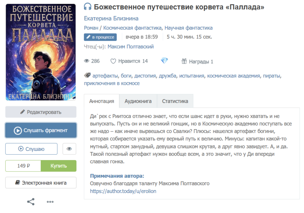 На скрине вы можете видеть, что приближается к финалу публикация аудиокниги, которую записывает самый лучший чтец АТ - Максим Полтавский. Вы могли слышать его голос, когда он озвучивал книги из топа АТ. А еще он вошел в список финалистов в конкурсе "Голоса АТ", а там отбор был жесточайший, около 900 работ, если я правильно помню.