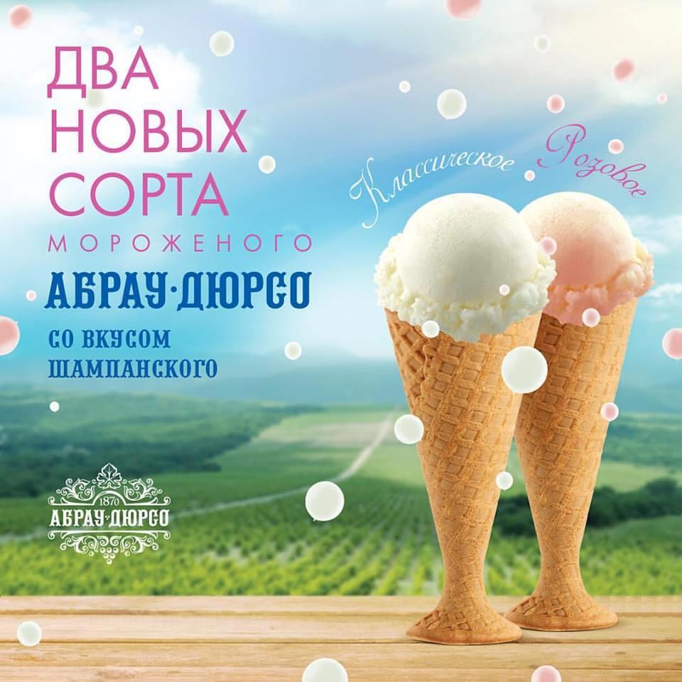 В России тоже не отстают от модных гастрономических веяний (ну, если только чуть-чуть), и вот в сентябре этого года самый знаменитый завод шампанских вин Абрау-Дюрсо совместно с сетью кафе «Баскин Роббинс». Результатом этого союза стали целых два вида мороженного: сорбеты Абрау-Дюрсо классическое, белое с тонами рислинга, и Абрау-Дюрсо розовое с нотами Пино-Нуара.