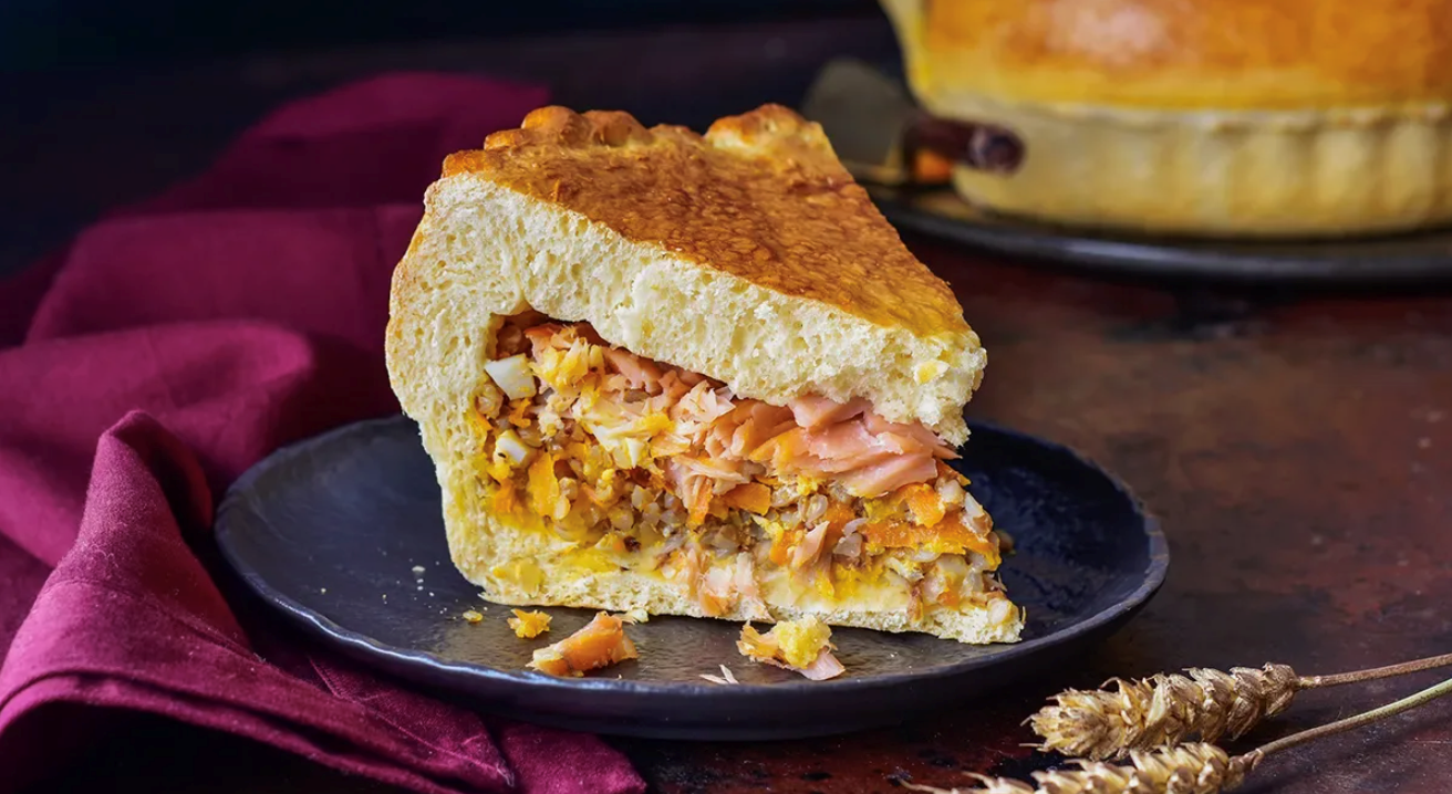 Поверх гречки уложите ломтики соленой рыбы. Свободные края пирога наложите на ломтики рыбы, прижмите пирог с боков.