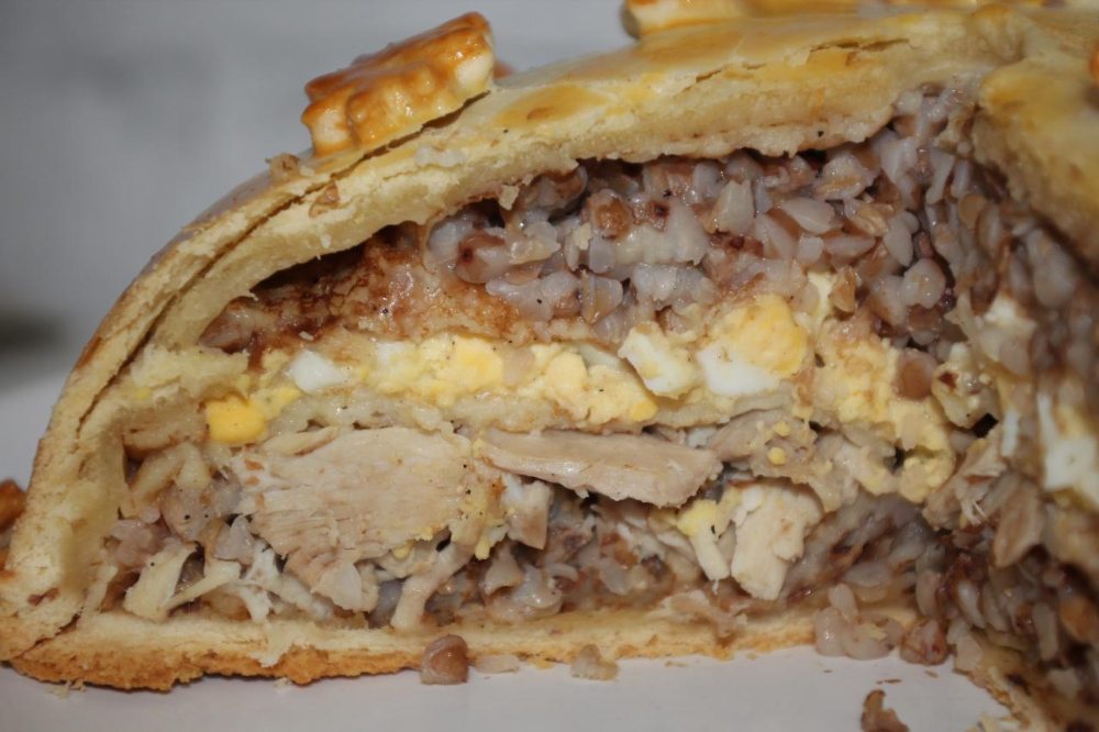 Тесто разделить на две неравные части. Большую часть теста раскатать в большой круг, уложить в форму и выложить начинки: сначала гречневую, затем куриную. Полить сливками и укрыть крышкой из второй части теста. Смазать желтком.