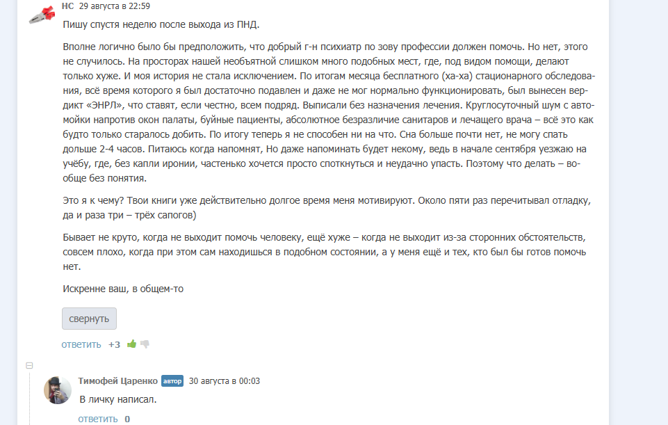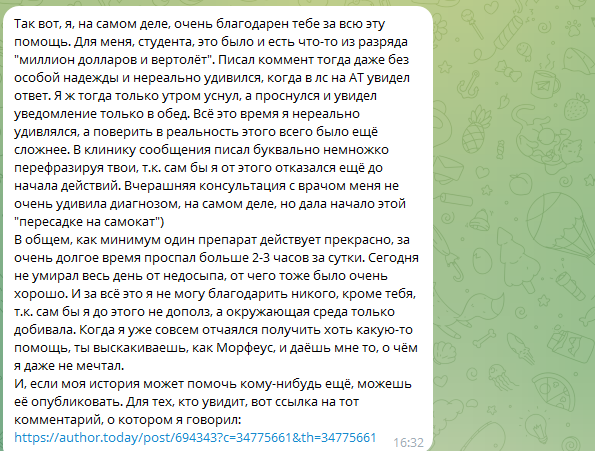 Парню я написал и стал узнать его историю. Человек не спит уже больше года! 3-4 часа сна. Он был в ПНД, он там две недели не спал и ЕМУ НЕ НАЗНАЧИЛИ ЛЕЧЕНИЕ. Он прошел то ли двух, то ли трех врачей. Даже не поставили диагноз.