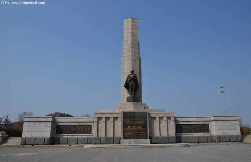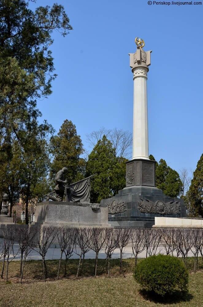 Монумент, который расположен перед территорией кладбища. До 1999 г. он стоял на центральной площади Даляня (Дальнего), которая тогда называлась площадь Сталина. В какой-то момент правительство провинции Ляонин в рамках генеральной реконструкции центра города решило перенести этот мемориал в Люйшунь, к русскому кладбищу. Напомню, Люйшунь сейчас административно является частью Даляня.