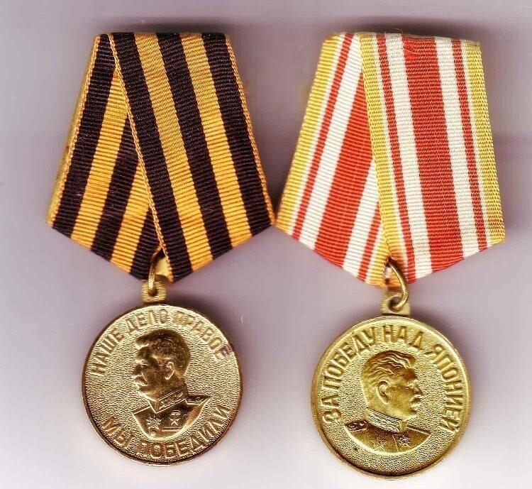 Обратите внимание на медали За победу над Германией название страны не несёт, а За победу над Японией - несёт. Кроме того, на одной медали профиль Сталина обращён на запад, а на другой - на восток