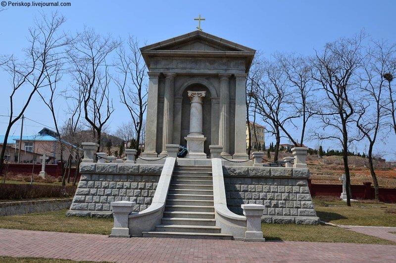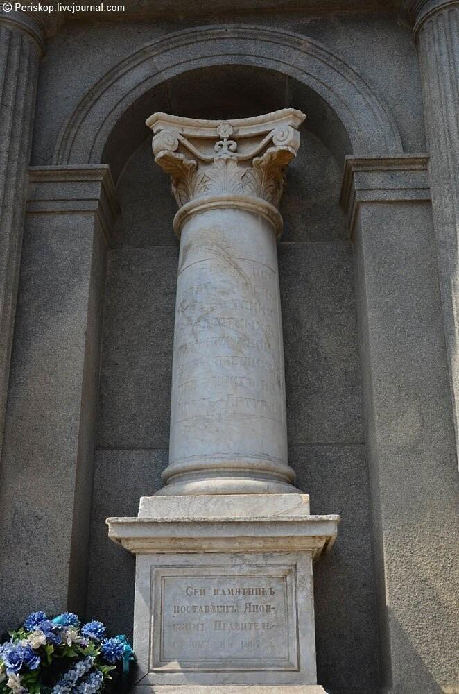 Это именно то место, где воинские почести были отданы японским военными. Японский полк склонил знамена перед могилами своих недавних врагов. После панихиды представители обеих стран поднялись на ступеньки часовни. Русские осеняли себя крестным знамением, а японцы преклонялись до земли.