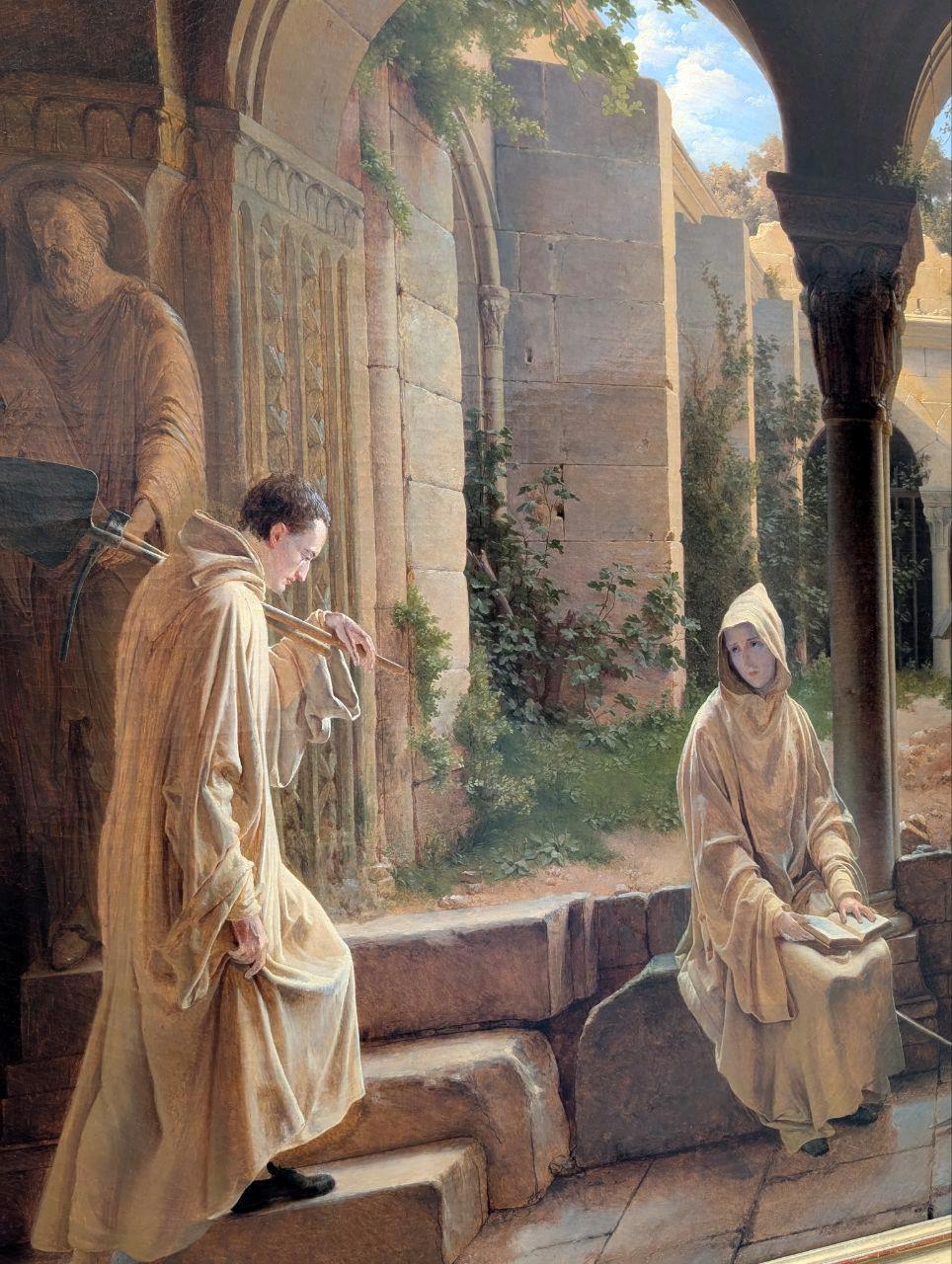 - Аделаида де Люссан и Комменж в монастыре. Тут замечательно то, что Аделаида и Комменж - герои романа Клодины де Тансен, французской писательницы 18 века. Семьи влюбленных ненавидят друг друга, обманутый родными Комменж удаляется в монастырь, но его возлюбленная переодевается в монаха, чтобы попасть в мужской монастырь и увидеться с Комменжем. Собственно, момент их встречи в монастыре и изображен на этой картине. Замечательно то, что роман Клодины де Тансен (многократно переизданный и переведенный на разные языки) вдохновил автора картины на такую масштабную и сложную в исполнении работу. То есть - мы все, особенно в детстве, рисовали героев любимых книг, но посвятить литературным героям несколько месяцев, если не лет, серьезного труда, выбрать местом их "встречи" реальный монастырь в Арле, тщательно изобразить его внутренний двор и галерею и т.д. - это нечто такое, чем автор книги может гордиться.