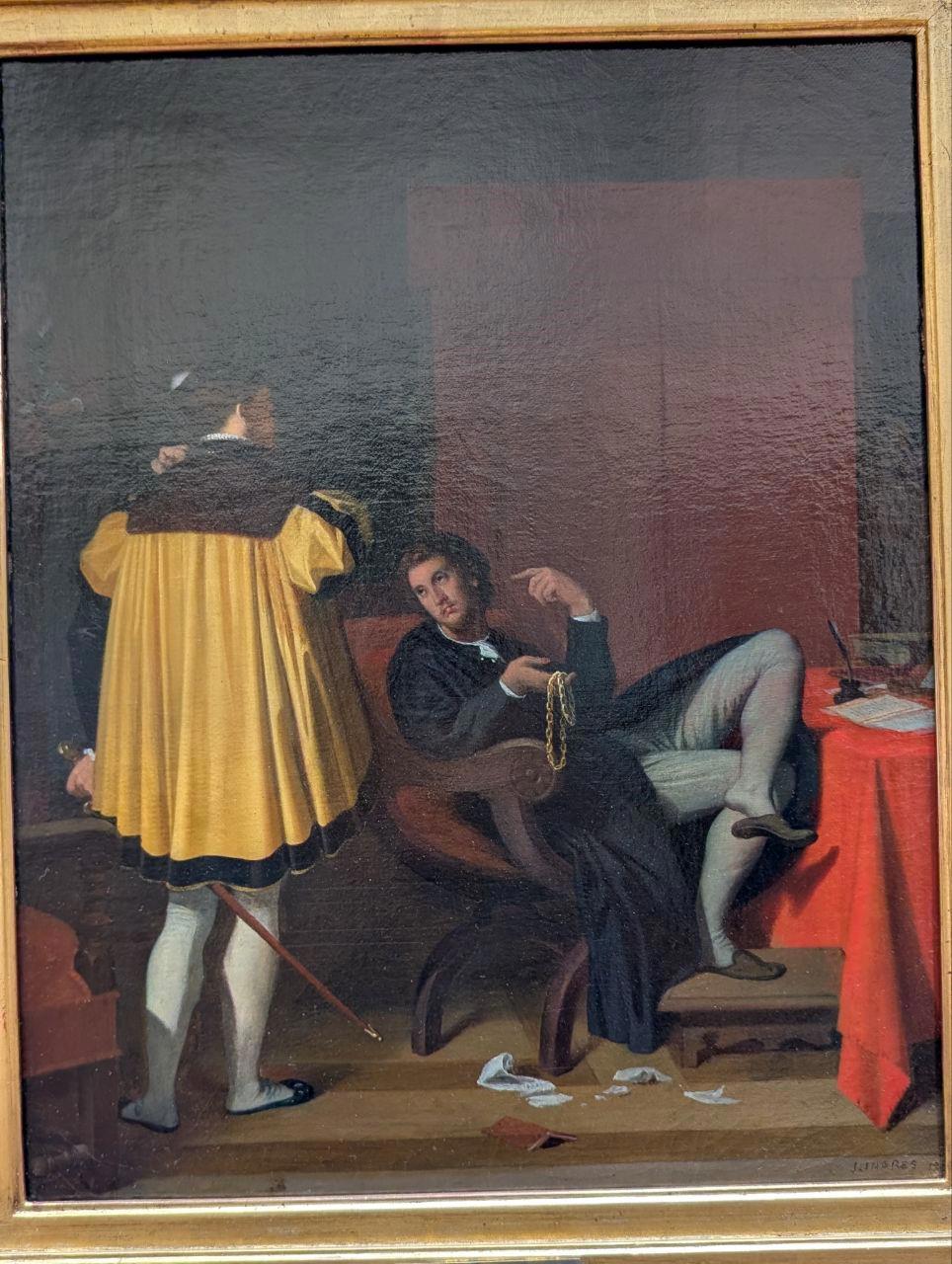 - Посещение Мишелем де Монтенем Торквато Тассо в заточении. Тассо редактирует "Освобожденный Иерусалим" в Замке д'Эсте, где он находился то ли в состоянии душевной болезни, то ли сильного нервного срыва, вызванного окружавшими его интригами и преследованиями (вроде попытки украсть его рукописи и т.д.) Совершенно очаровательно, на мой взгляд, выглядят сползшие чулки Тассо (деталь, которая лучше всего передает его состояние) и вообще этот контраст между щегольским и безукоризненным видом Монтеня и расхристанным видом заключённого.