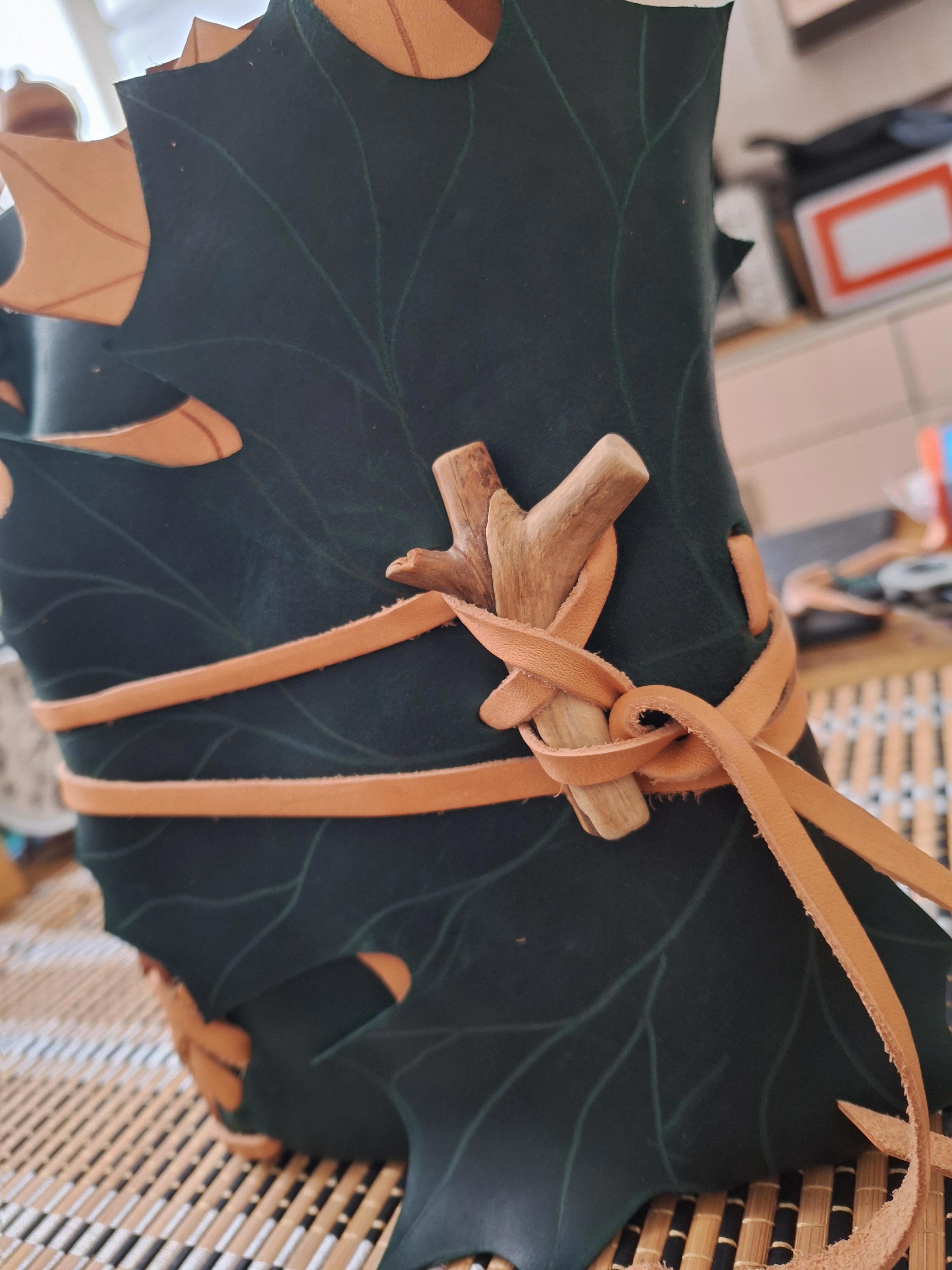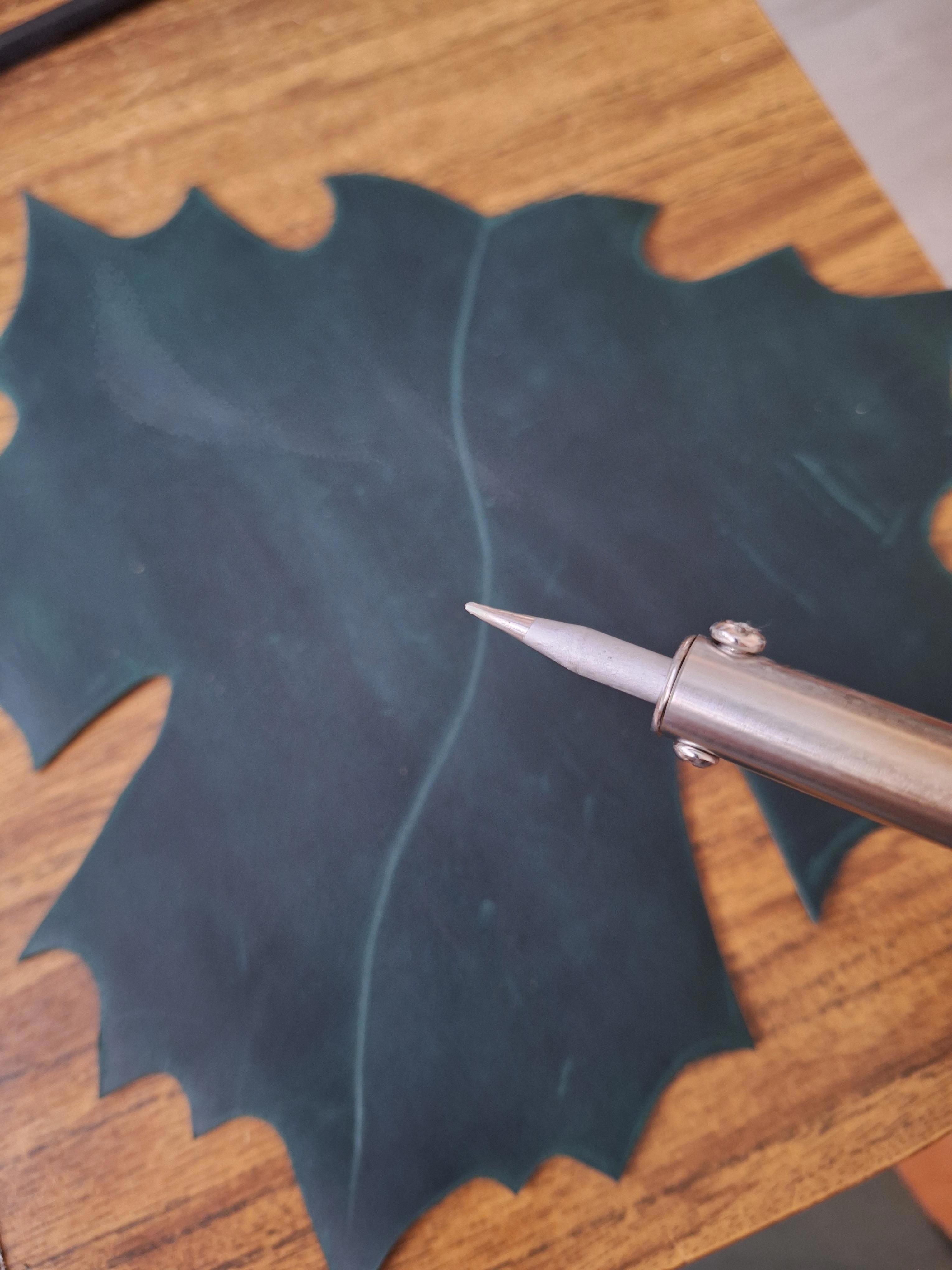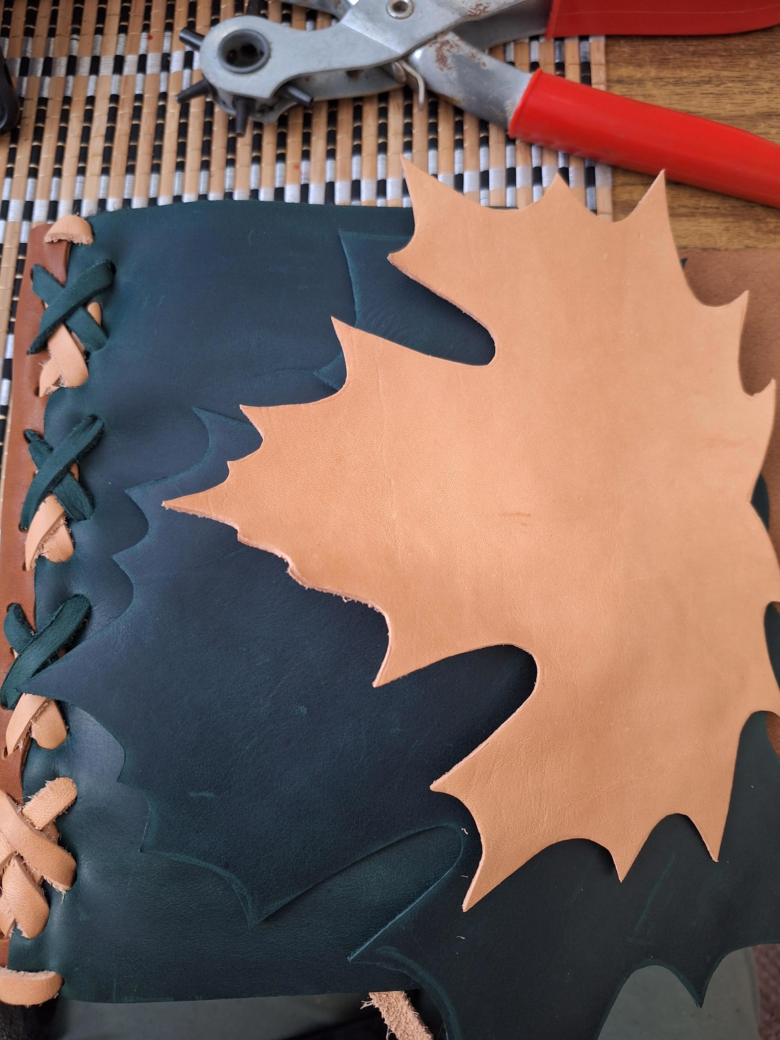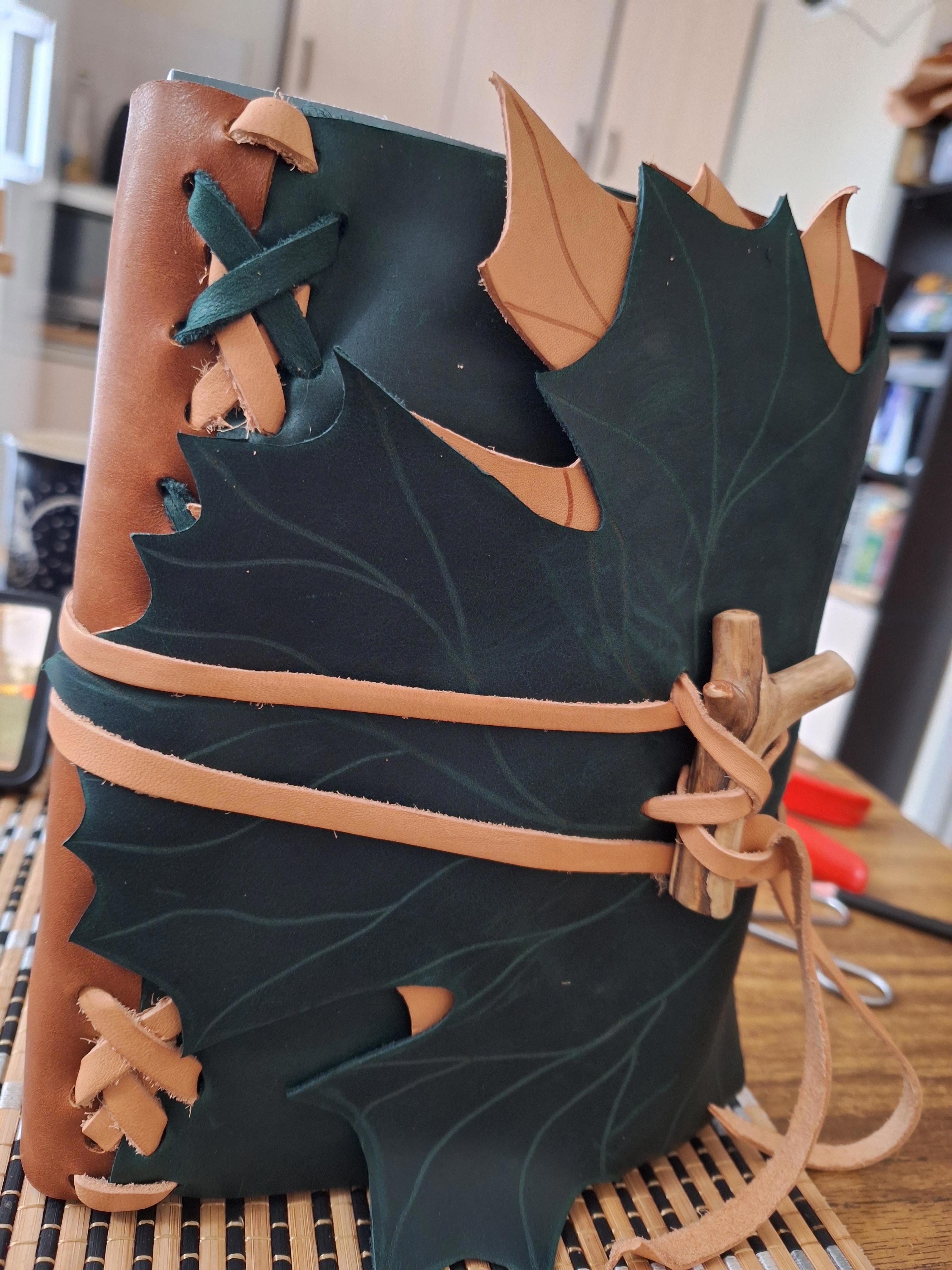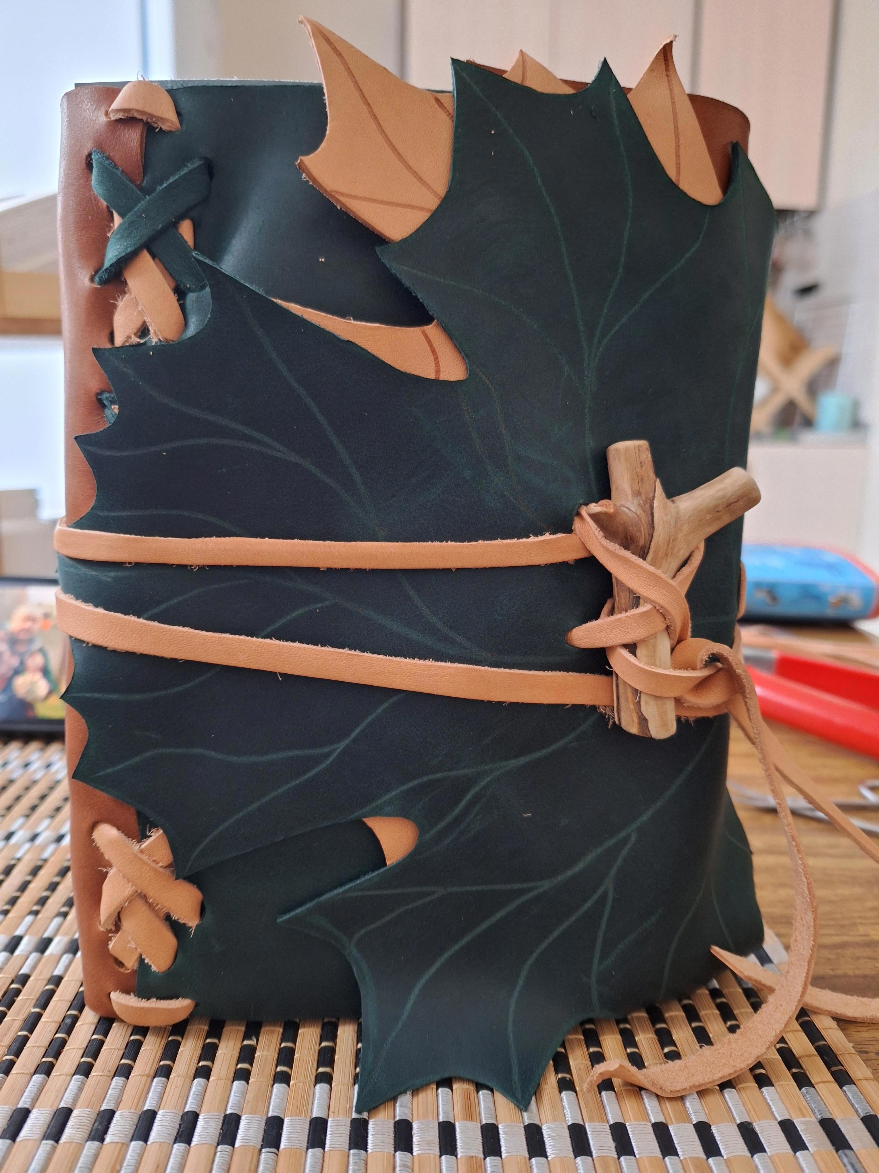 Вырезаем по бумажным заготовкам из кожи листья (при скруглении рисунка не отрывая ножницы от кожи, одним укусом, как говориться, чтобы не оставить множество зазубрин). Выжигаем или рисуем прожилки на листьях и шнуровкой лепим листья на обложку (на клапан) туда же декор и еще один шнур для завязки))