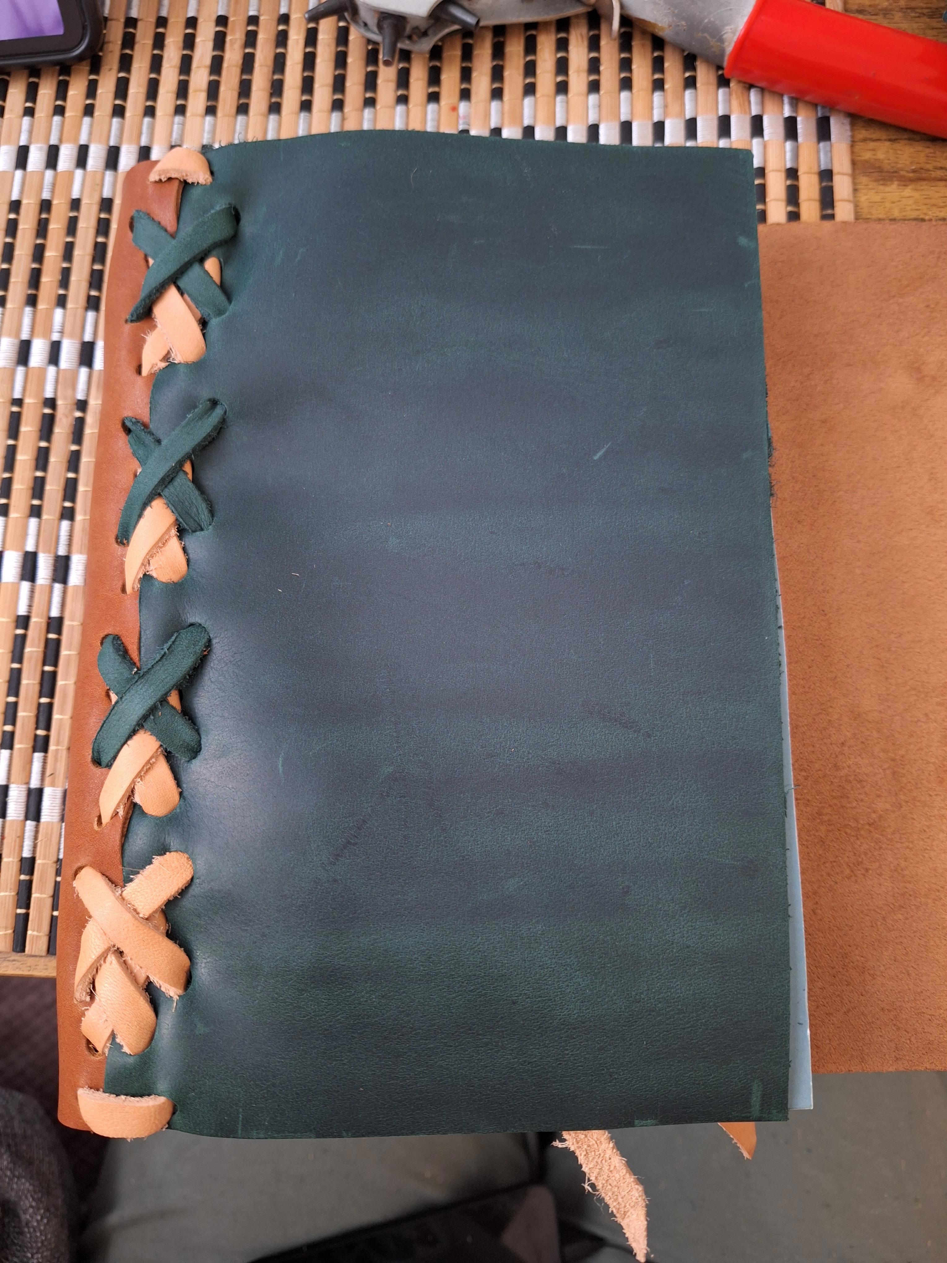 Я решила сделать обложку из двух частей а4+а5, с плетением, место шва разрисовываем паралельными точками по рисунку плетения простым карандашом и дырявим))