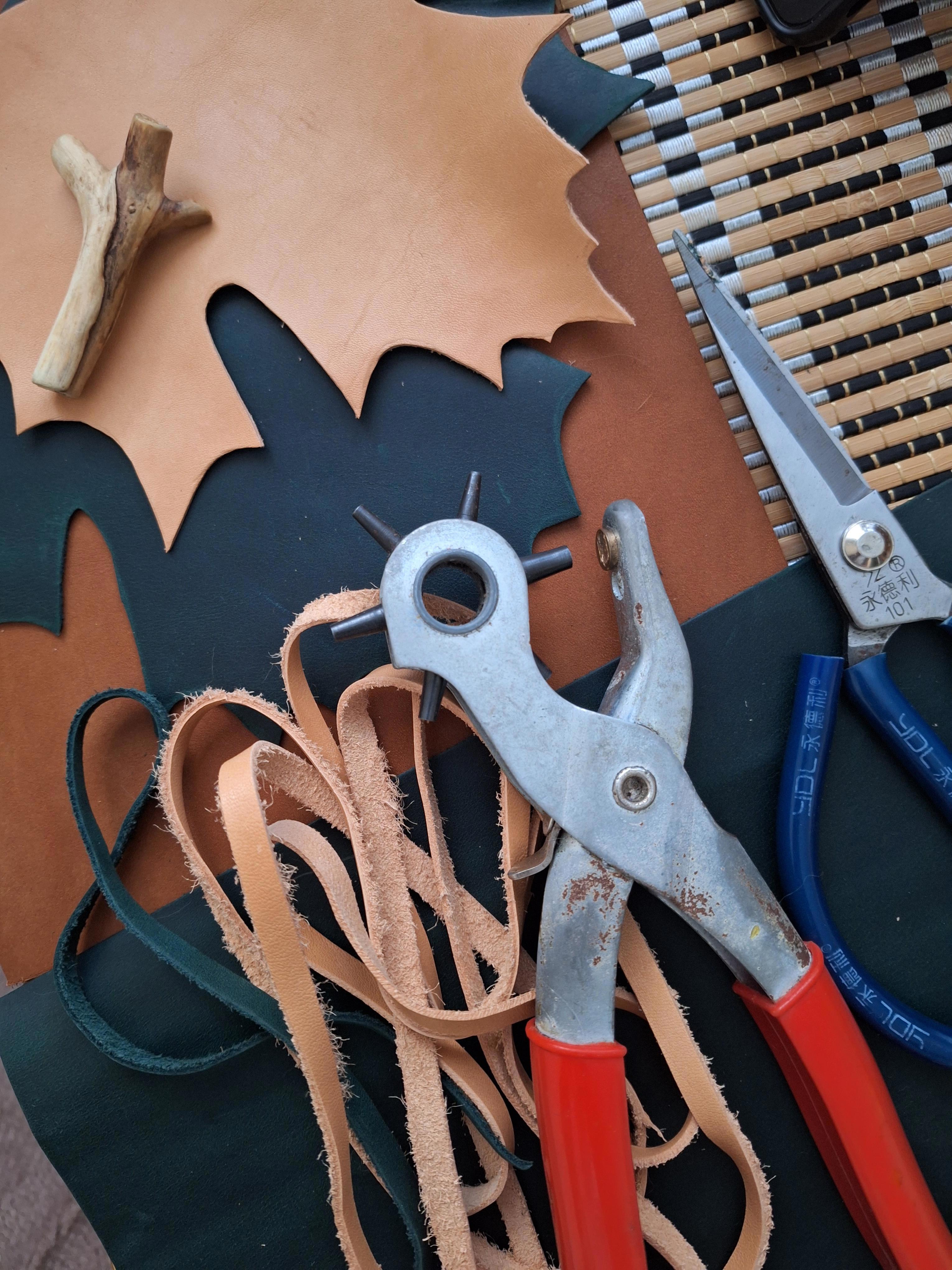 кожаные шнуры (их тоже можно купить, а можно нарезать самим, для этого я покупаю недорогие обрезки, чем тоньше шнур, тем аккуратнее плетение, я резала от той же кожи, поэтому рисунок обьемный, но он станет более отчетливым со временем)