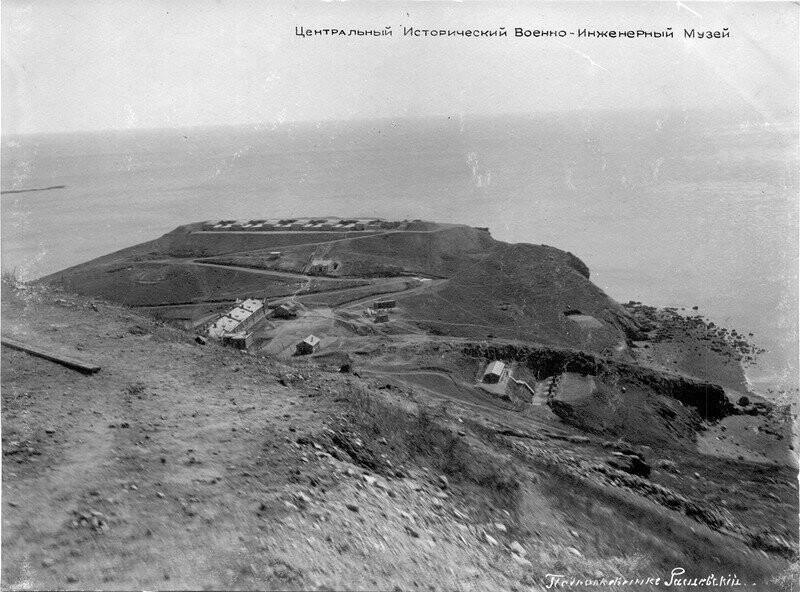 Батарея Электрический утёс № 15 на пять 10 длинных пушек. Внизу видны кинжальная батарея № 14, большое здание артиллерийская казарма, правее её минная станция инженерного ведомства.