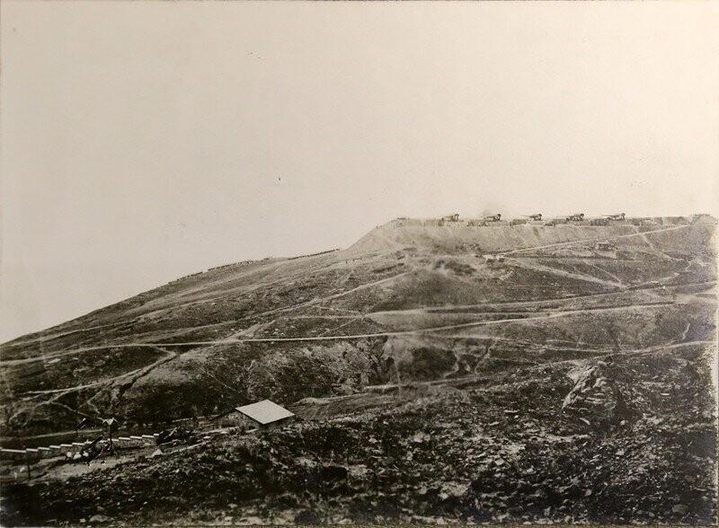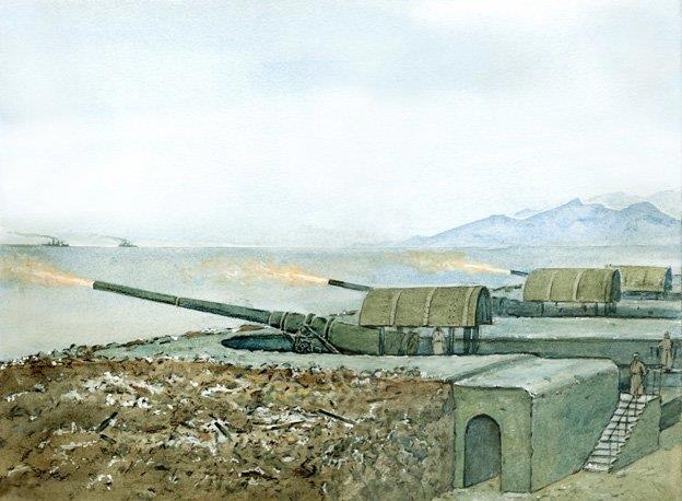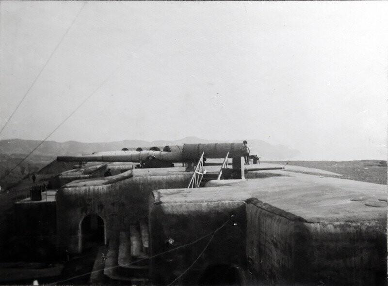 Батарея № 15 Электрический утёс крепости Порт-Артур. 10-дм. орудия обр. 1895 г. на изначальных лафетах Дурлахера, низких, с броневыми навесами, повёрнуты на обратную директрису стрельбы, то есть в сторону сухопутного фронта. Рядом с 254-мм орудиями мы видим 57-мм пристрелочную пушку.