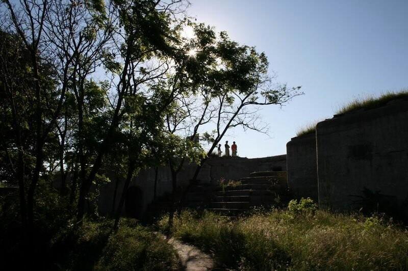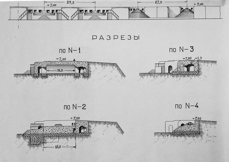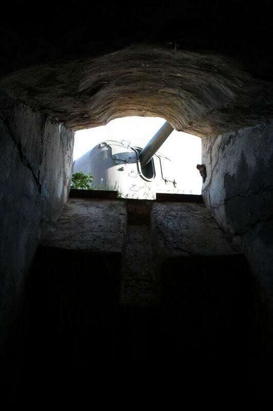 На батарее один фундамент без орудия, зато видна конструкция. Чуть дальше мы видим лестницу в дворик для 57-мм орудия, тоже пустой.