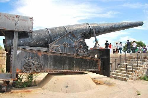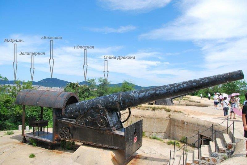 Предположительно, это 6-ти дюймовая пушка на станке Дурляхера. Расположенная в вынесенном перед бруствером батареи № 15 послевоенном дворике под Б-13. В советское время батарея была расширена. А эти две пушки радуют до сих глаз любителей военной истории своей мрачной решимостью 1904 года.