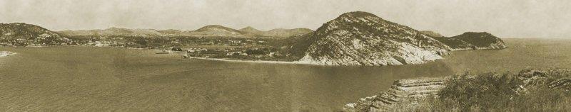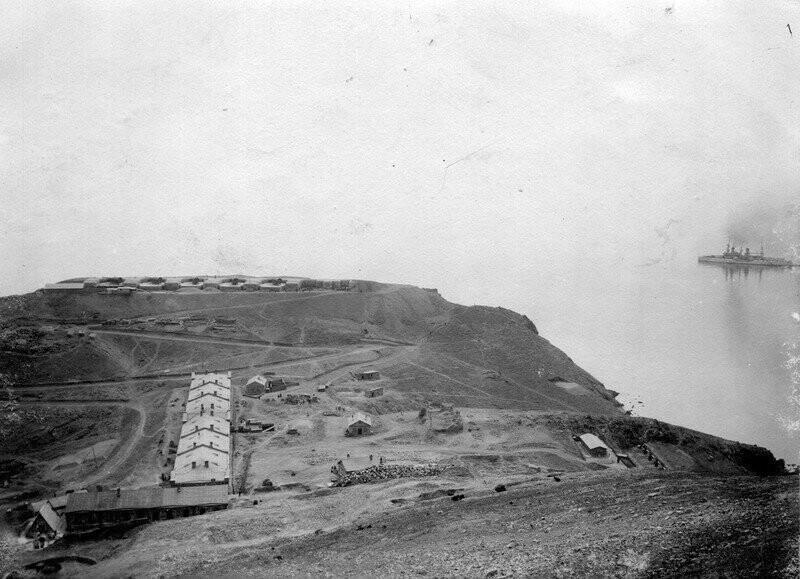 Батарея Электрический утёс. На море виден броненосец "Петропавловск". Приблизительно на этом месте корабль и погибнет на японских минах. Есть такое слово фарватер.