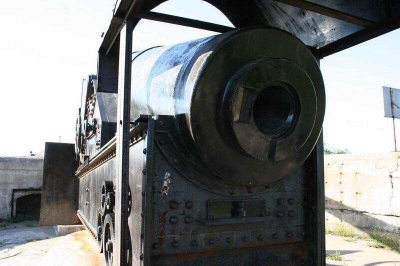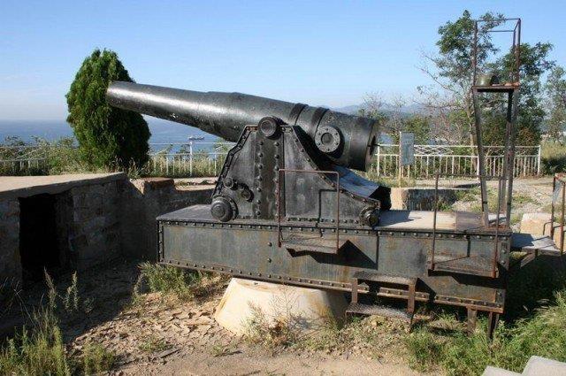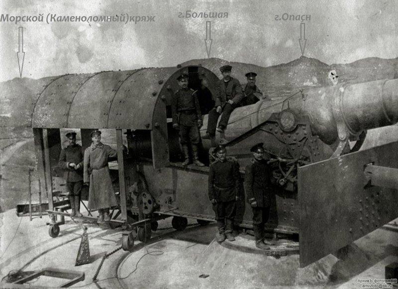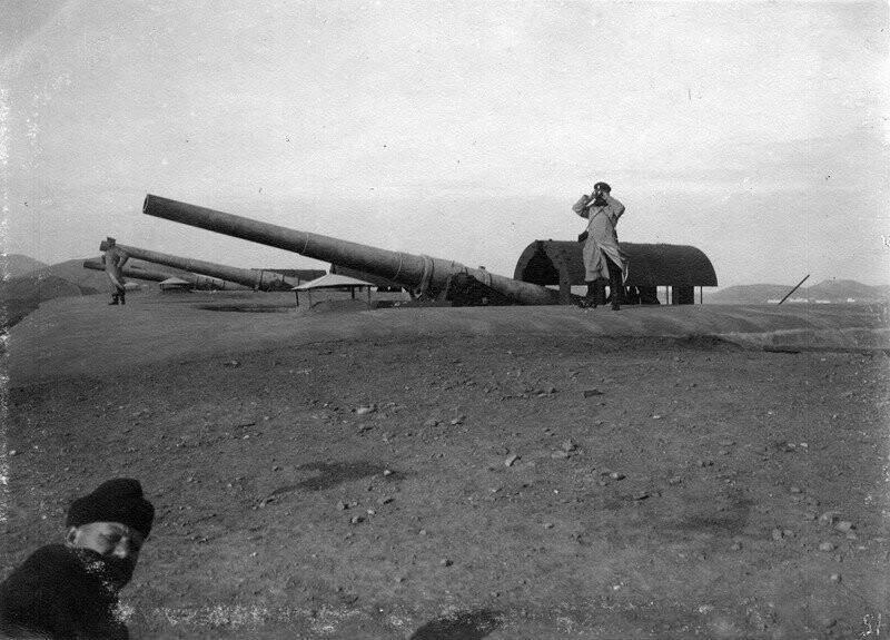 Наиболее мощные орудия береговой обороны 10'' орудия батареи Электрический утёс. У броневого кожуха стоит командир батареи капитан артиллерии Жуковский