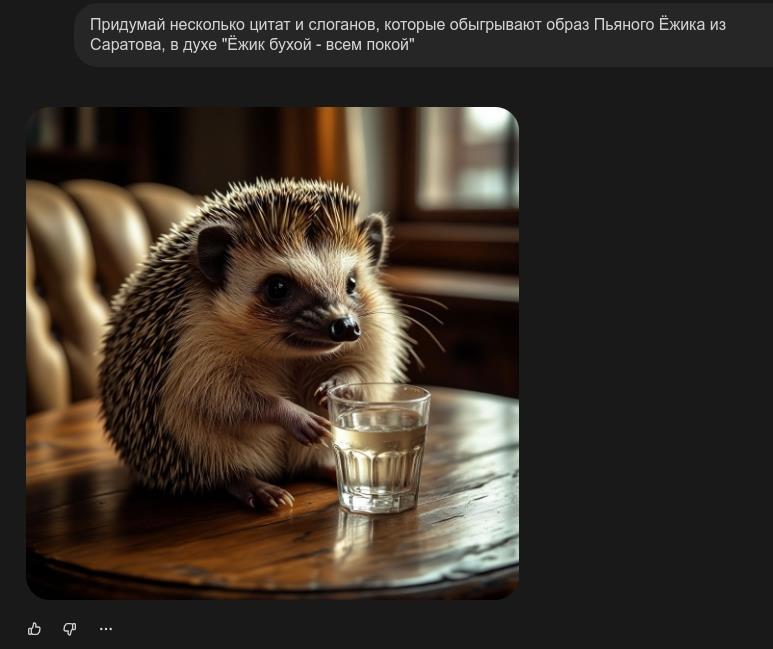 Остается загадкой, что именно видят нейросети в этом образе. Возможно, квантовую запутанность саратовских улиц, возможно, метафизическую тоску по дому в глазах колючего создания, а возможно, их просто научили, что с ёжиками шутки плохи. Как говорится, ёжик бухой — всем покой. Искусственному интеллекту — тем более.