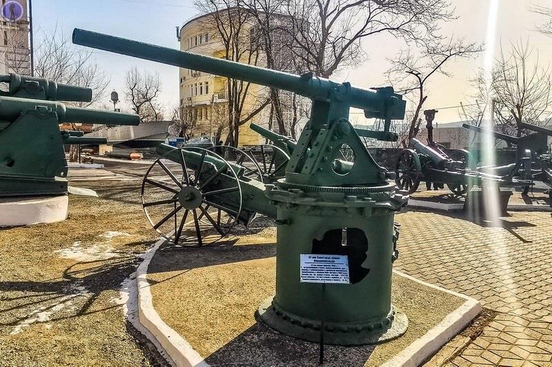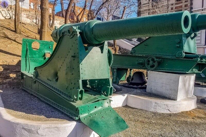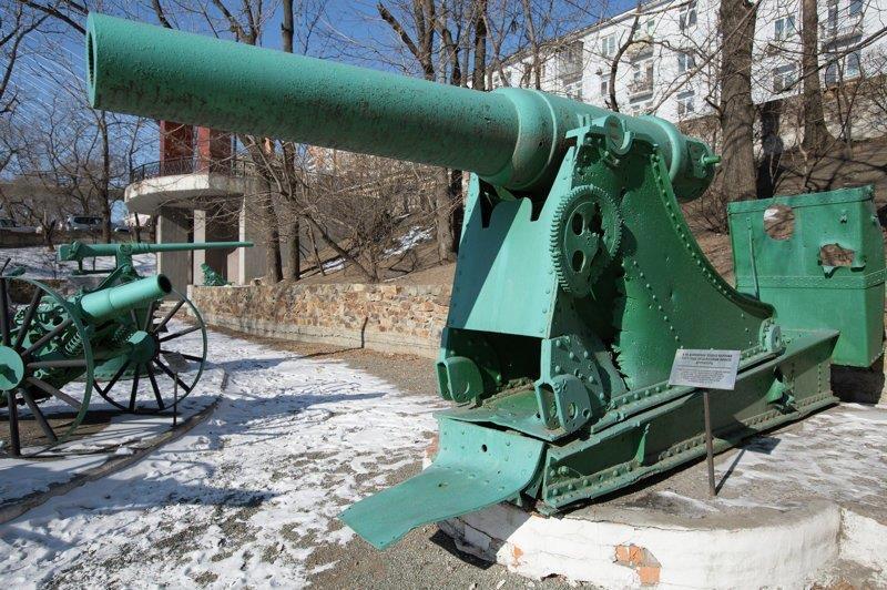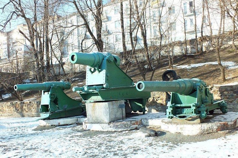 Одно из этих орудий, как раз с боевыми повреждениями в левой части находиться во Владивостоке.