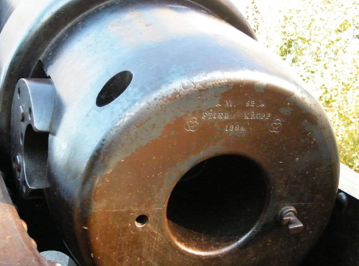 Правое орудие имеет № 179, произведено в 1895 г., на левом основная часть казенника все еще покрыта толстым слоем краски, но контуры эмблемы фирмы "Крупп" (три переплетенных кольца) проглядывают.