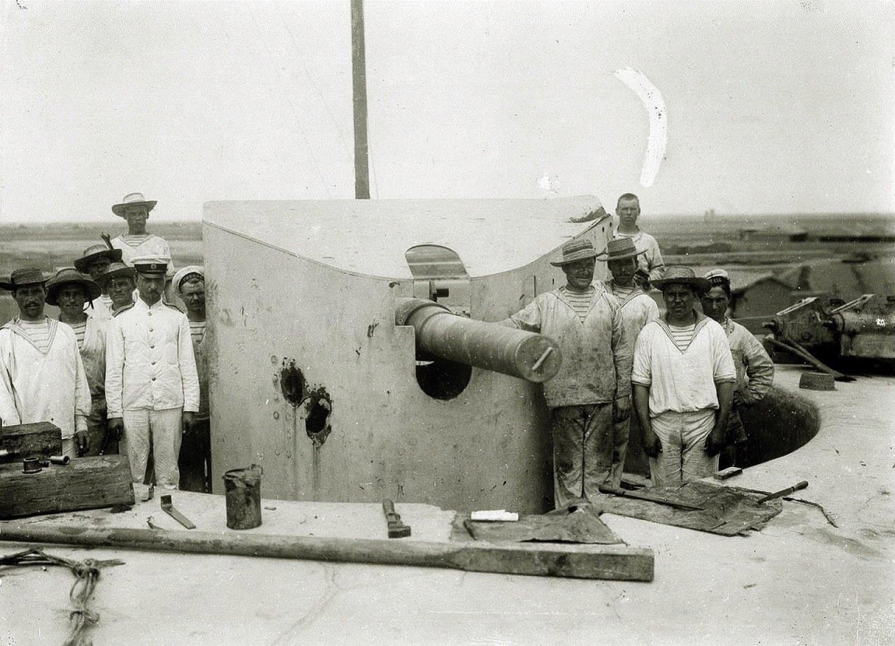 Офицер и матросы крейсера "Россия", у китайского берегового орудия, 1900 г.