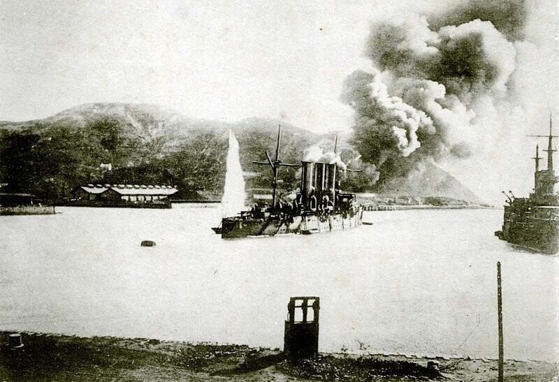 Более 100 лет назад этот же пейзаж выглядел так. Это наши крейсер «Паллада» и эскадренный броненосец «Победа» под обстрелом японских 280-миллиметровых гаубиц