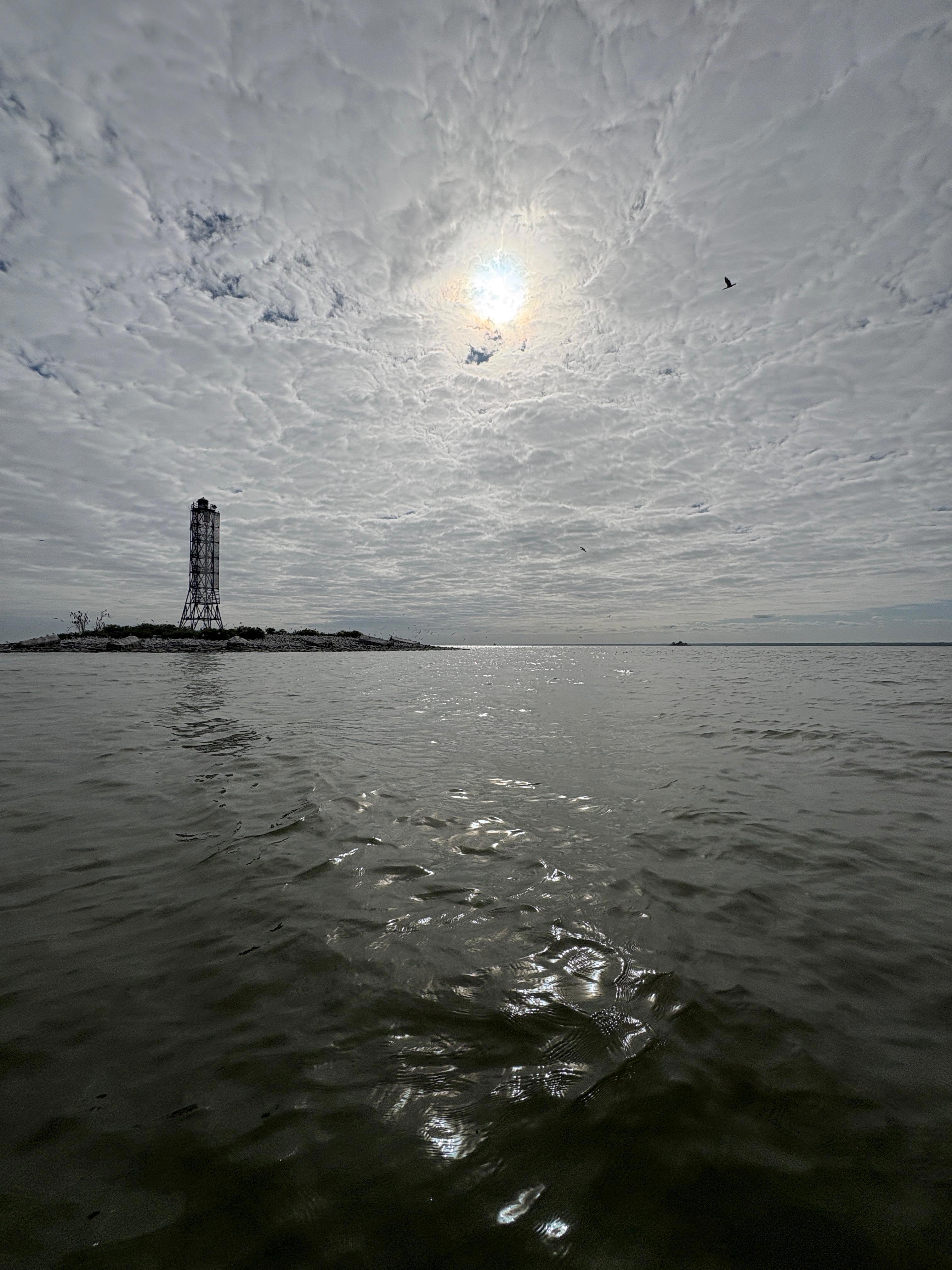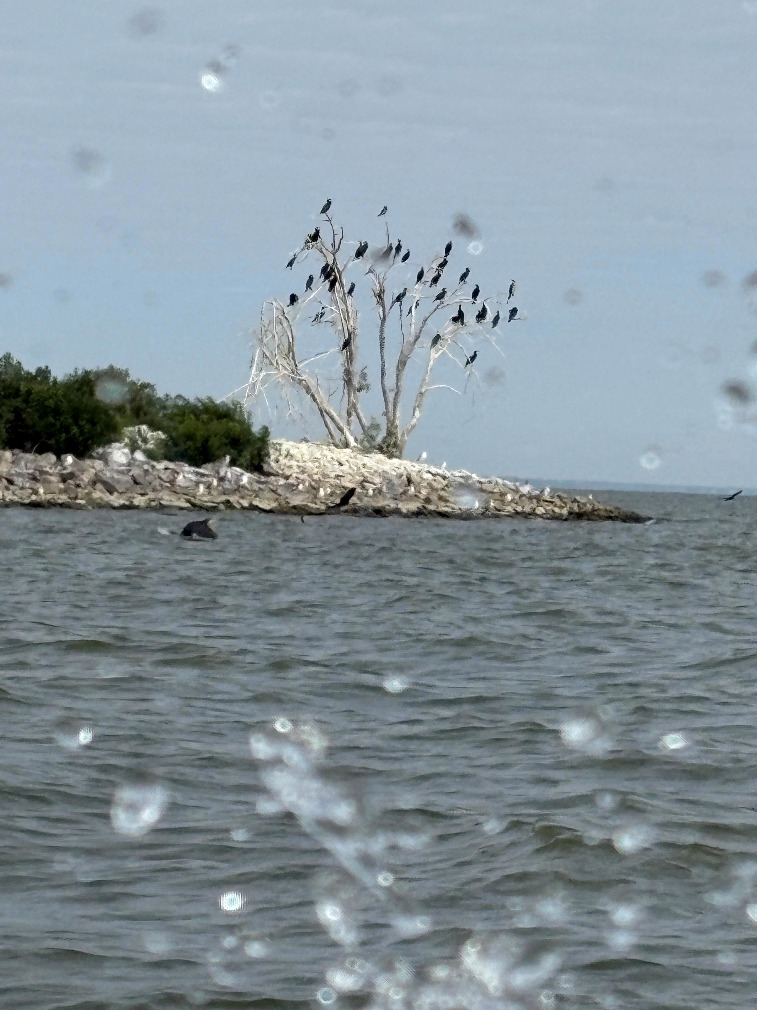 Весь покрытый чайками остров казался белым. Сбоку торчало белое сухое дерево, который украшали черные бакланы.
