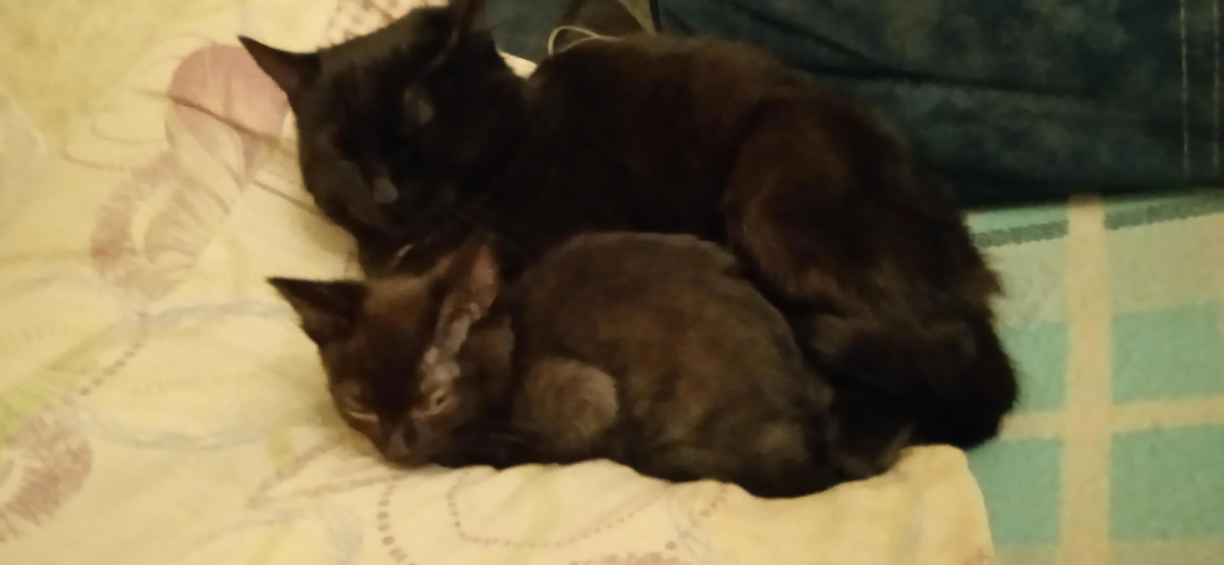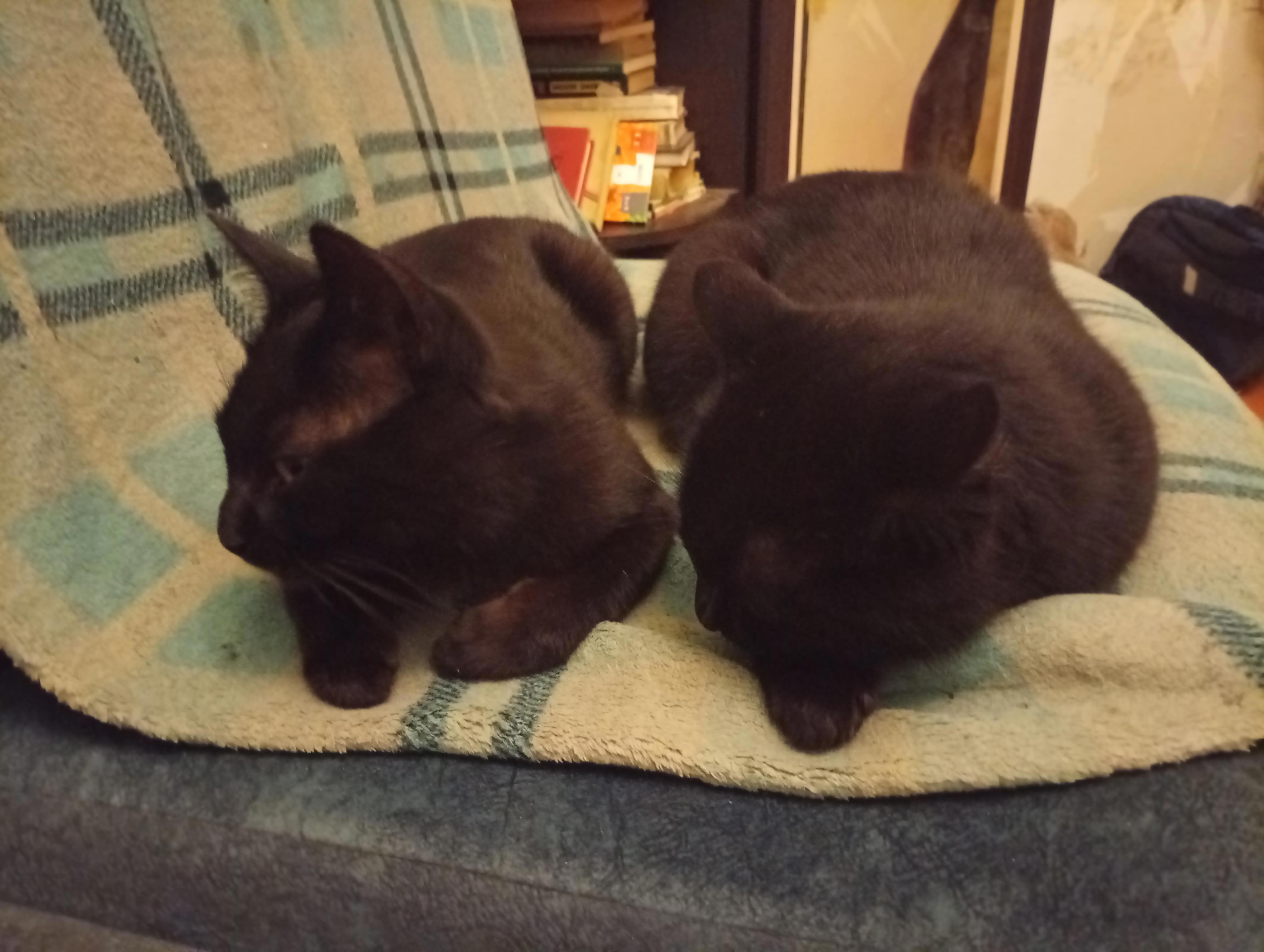 2 черных кота, у них пятна на груди ( пара десятков белых шестинок) в одинаковых места, разница примерно 7 месяцев,