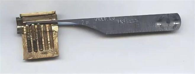 Собственно отмычка. Это узкая пластинка (должна входить в замочную скважину с учётом того, что там уже вороток) с небольшим выступом на конце. Её задача — нащупать каждый из секретов и сдвинуть его на столько, чтоб он переместил запирающий штифт ровно на разрез. Чем хуже собран замок и с большим люфтом — тем легче это сделать.
